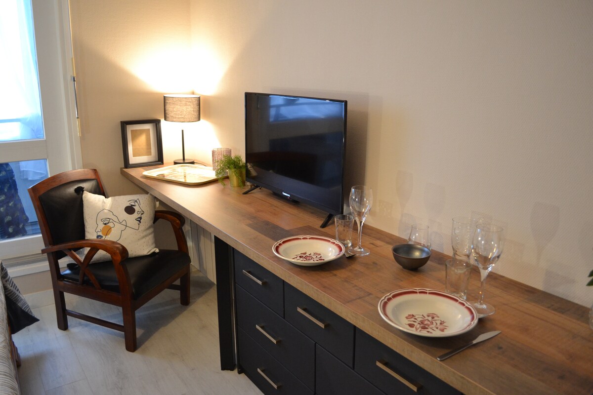 Studiya yaşayış yeri üçün ümumi bağ sahəsi olan birinci mərtəbədə yerləşir. O, 2025-ci ilin may ayında dəyişdirilmiş 140x200 çarpayı, təchiz olunmuş mətbəx sobası, mikrodalğalı soba, induksiya hobu, qəhvə maşını, dolce gusto pod maşını, tosterdən ibarətdir... Yaşayış yeri ilə üzbəüz: çimərlik, kazino, restoran, talassoterapiya institutu, yelkənli klub. Piyada yaşayış yerindən bir neçə metr məsafədə: restoranlar, mağazalar, barlar, mini qolf... Sizi səbirsizliklə gözləyirik! ML