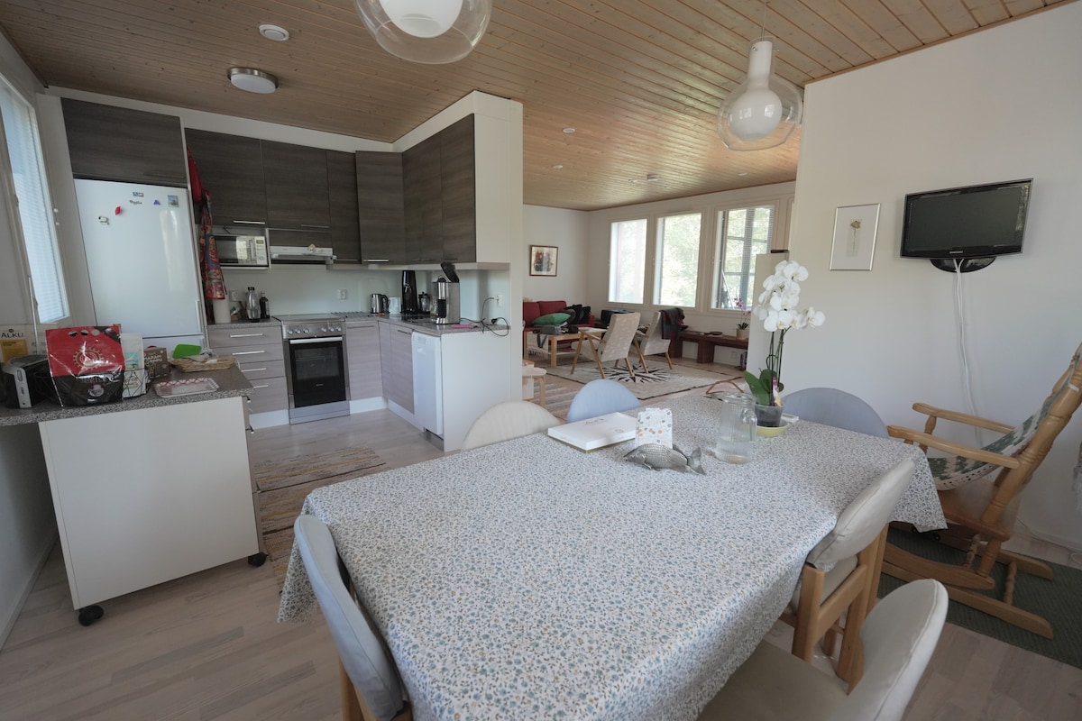 Həyətimizdəki sauna otağında, göl kənarında dincəlmək üçün xoş gəlmisiniz! Kiçik, lakin dəbli sauna otağı yaşayış həyətimizin bir hissəsi olsa da, burada sülh, təbiət, məxfilik və gözəl mənzərə tapacaqsınız. Məkan uzaqdan işləmək üçün də əladır. Lahti çimərliyi dayazdır və uşaqlar üçün əladır. Avarçəkmə qayığından və avarçəkmə lövhəsindən istifadə edin. Motorlu qayıqla balıqçılıq üçün icarəyə verilir. Öz döşəkağılarınızı və dəsmallarınızı gətirin. Lazım gələrsə, qonaqlama yerindən yataq dəsti təmin edilə bilər.