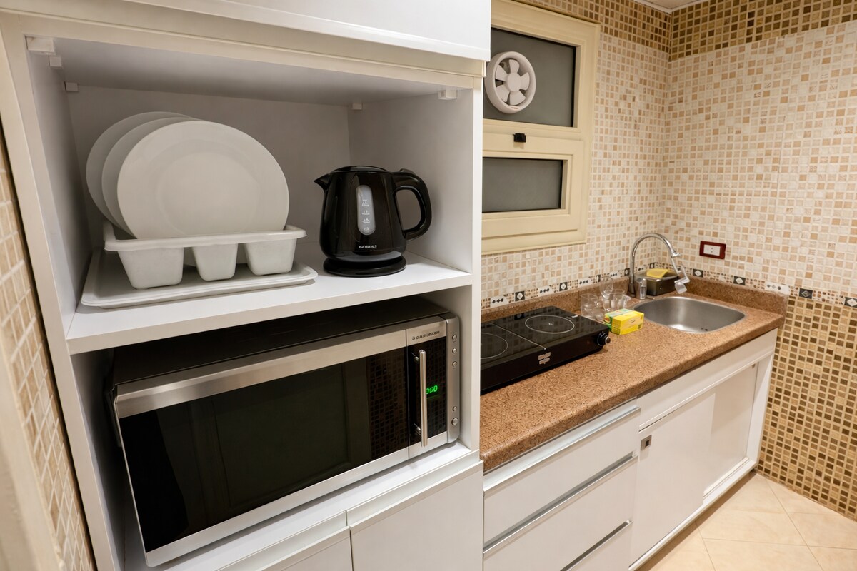 You won’t forget this trendy studio fits for 3 guests comfortably. Has 1 King bedroom with luxuries Jacuzzi & cordless massager while watching 55" Samsung smart TV for an exceptional experience all at once. It's perfect for couples, solo & business travellers. Also features a full bathroom, open kitchenette fully equipped Start your mornings wz rich cup of Nespresso machine Wz 2 free capsules. Please note that Arab and Egyptian citizens are required to submit proof of marriage before check-in.