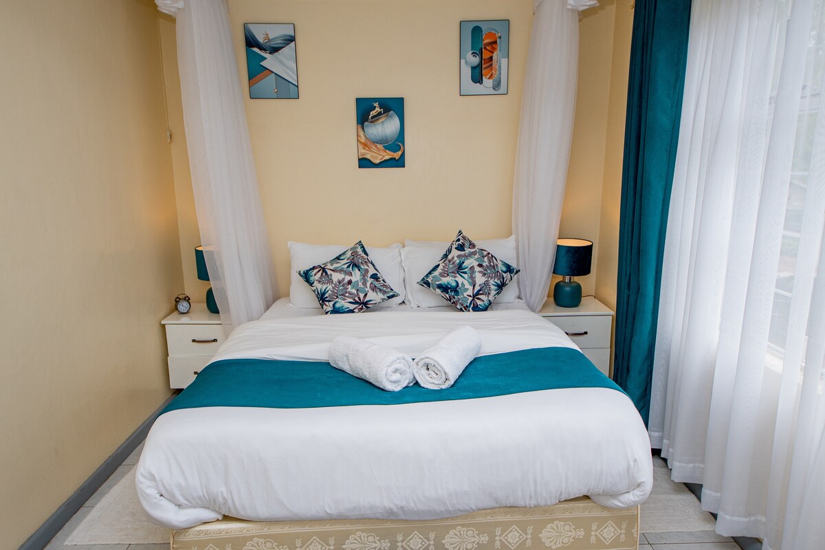 Located in a quiet area in the heart of Nairobi, Kileleshwa, Bella Vista is a tastefully designed 1 bedroom apartment that sits on the ninth floor of a modern block of apartments, with proximity to malls and a short drive to Nairobi National Park. The highlight of one’s stay is undoubtedly the breathtaking views of nature in abundance, as well as Nairobi’s skyline and catching Nairobi’s sunset in all its glory, which can be enjoyed from the comfort of the bedroom or the living room balcony.