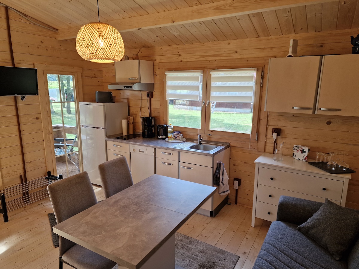 Unsere neue, komplett möblierte und geschmackvoll eingerichtete Holzhütte bietet Ihnen eine erstklassige und ruhige Ferienunterkunft. Mit einer großzügigen Fläche von 40m² haben Sie ausreichend Platz für bis zu vier Personen. Sie verfügt über ein Bett im separaten Schlafzimmer (160x200) und eine Schlafcouch in der offenen Wohnküche. Außerdem steht Ihnen ein privates Bad und sowie eine eigene Terrasse zur Verfügung. Wir freuen uns auf eure Buchung. Rainer und Kati