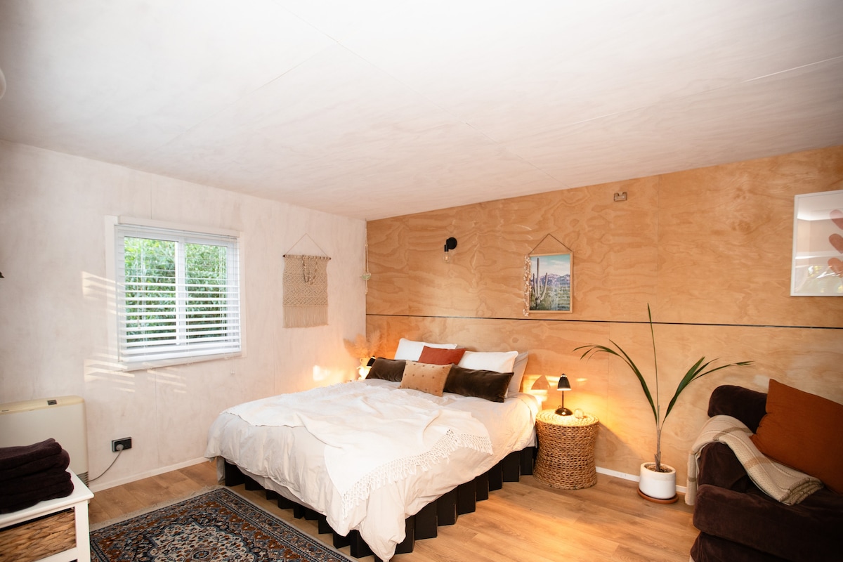 Bu özünə məxsus qurğu Yeni Plimut şəhərindən və kostyumlu gəzinti yolundan 10 dəqiqəlik məsafədə yerləşir. Burada ehtiyacınız olan bütün imkanlara malik isti rahat məkan var. Əsas evdən ayrıca girişi var və öz vanna otağı və balaca mətbəxi (mikrodalğalı soba, iki element, soyuducu, çaydan və toster ilə) ilə daha çox məxfiliyə imkan verir. Çoxlu pulsuz küçə parkinqi, eləcə də airbnb-nin yanında tək avtomobil dayanacağı var (yalnız kiçik avtomobillər üçün).