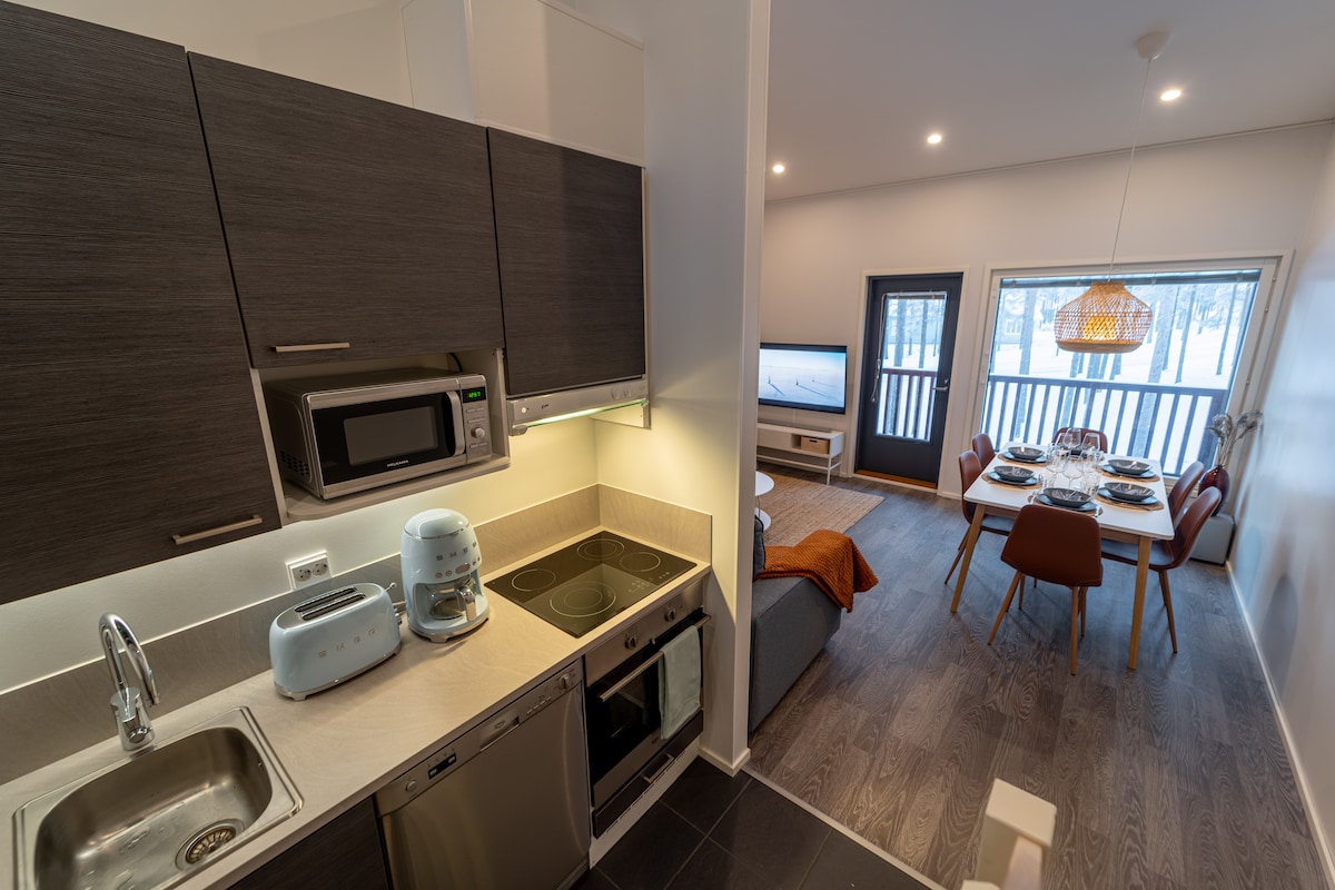 Sun Villas A23 Kalajoki Sandbanks xidmətlərinin ortasında rahat və müasir bir evdir. İkimərtəbəli loft mənzil mərkəzdədir, lakin sakit bir yerdə, balkondan gözəl meşə mənzərəsi var. Çimərlik, xizək yolları və yürüyüş yolları piyada məsafəsindədir. Ev heyvanları da qəbul olunur! Mənzildə bir iki nəfərlik yataq otağı, yuxarı mərtəbədə kiçik yataq otağı və işçi stansiyası olan lobbi var. Qonaq otağında divan çarpayı var. Burada 4+2 qonaq üçün yer var.