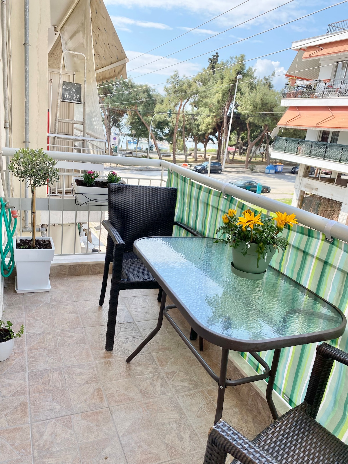 A fully equipped apartment on the 3rd floor , personally decorated with an artistic,unique style. Beautiful view of the sea ! -The flat is 8 km away from the city center, 8 km away from Thessaloniki airport and 50 meters away from the sea side. - 1 bedroom with a full sized bed and a relaxing premium mattress - 1 sofa bed in the living room -We provide you with all the essentials to ensure a pleasant stay such as washing machine, big closet,high quality speakers etc. -Pets are welcomed as well