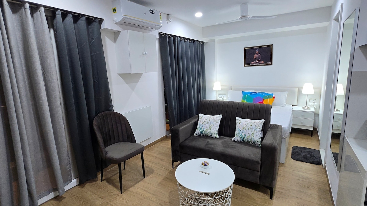 Welcome to our brand-new, spacious 2-BHK apartment, ideal for families and couples seeking comfort and convenience. The bedrooms have queen size beds with orthopedic mattresses and AC for a restful night's sleep. Relax in the large living room with a 43-inch Smart TV, lightning-fast WiFi and a dedicated dining area. Comes with two super clean bathrooms stocked with bath essentials. The fully equipped kitchen includes high-quality appliances and crockery for your culinary adventures!