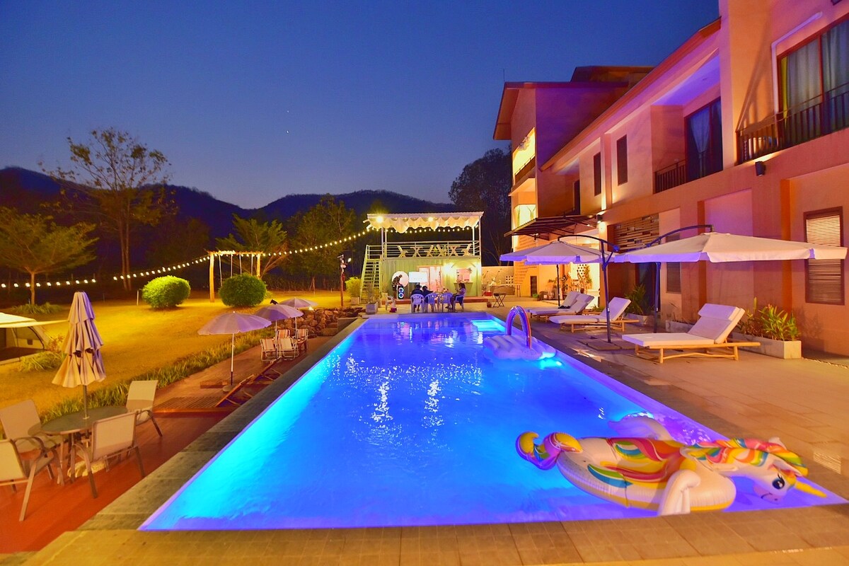 A hillside villa in the midst of natural views of Ratchaburi and Kanchanaburi. Private swimming pool, for relaxing and chilling with 360-degree natural views, surrounded by nature and mountains. In the evening, let's have a fun and chill out grilling party in the middle of the forest
