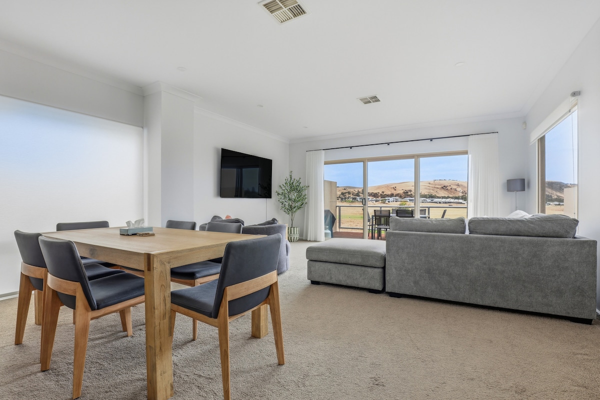 19th Hole – golf side luxury with spa bath and pool Welcome to the 19th Hole, your serene escape beside the lush fairways of Lady Bay Golf Course. This stylish three-bedroom townhouse blends comfort, elegance, and a prime location – ideal for golfers, couples, or families seeking a relaxing retreat. Start your day with sweeping views from your private balcony; tee off on the championship course, unwind by the pool, stroll along Normanville Beach, or enjoy the local resort, cafés and restaurants.