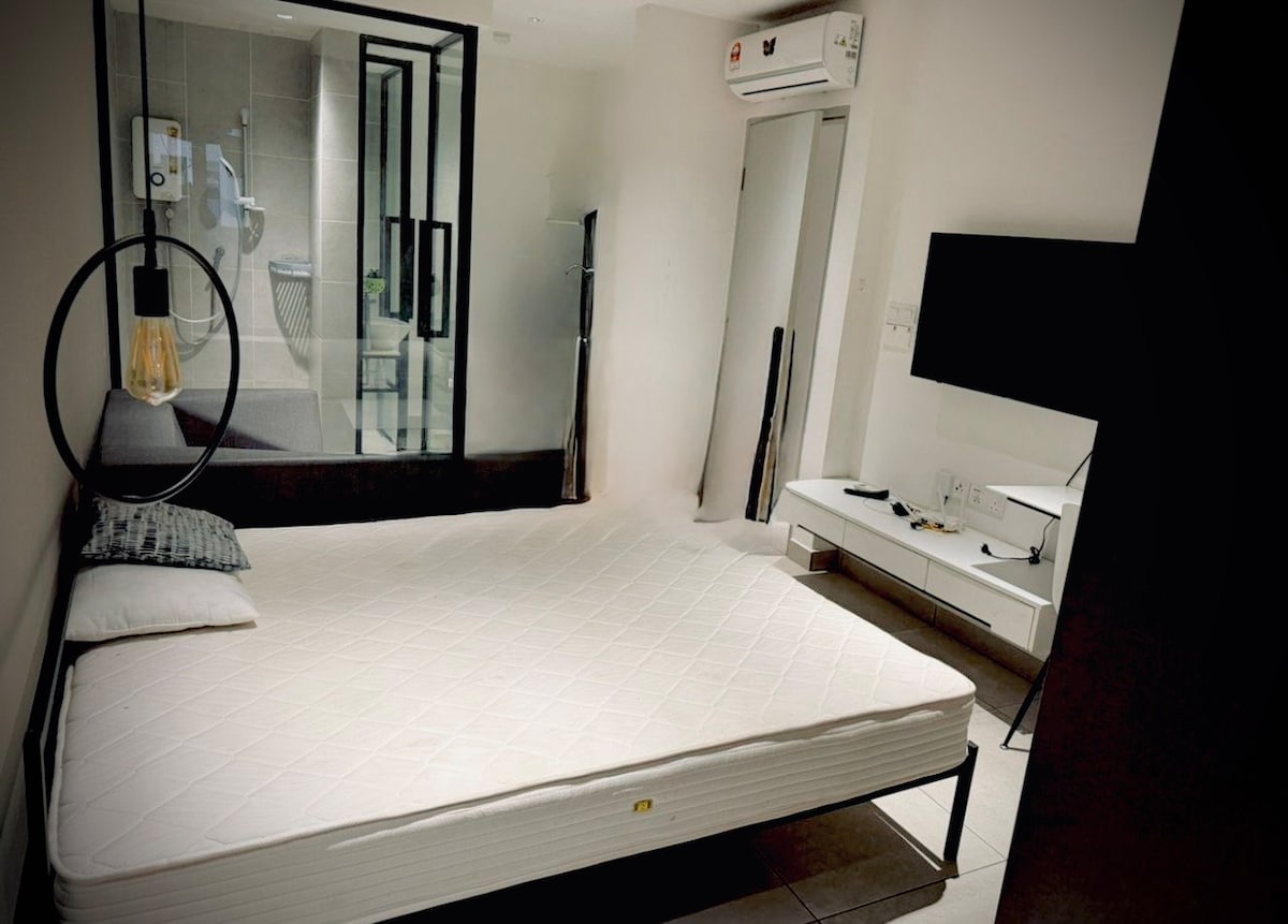 A perfect staycation in an entire studio, which comes with Slumberland president suite king bed and 55 inch smart TV, located in Shah Alam -> Front shoplots have 711, zus coffee, mixue, 99Speedmart, cafe. ->Next to Penisular International School and JsA arena ->800meter to National Institutes of Health(NIH) ->3min drive to Setia City Mall ->5min drive to Setia City Convention Center ->7min drive to Malaysia Longest Night Market(Pasar Malam on saturday) ->20min drive to WaterWorld by i-City