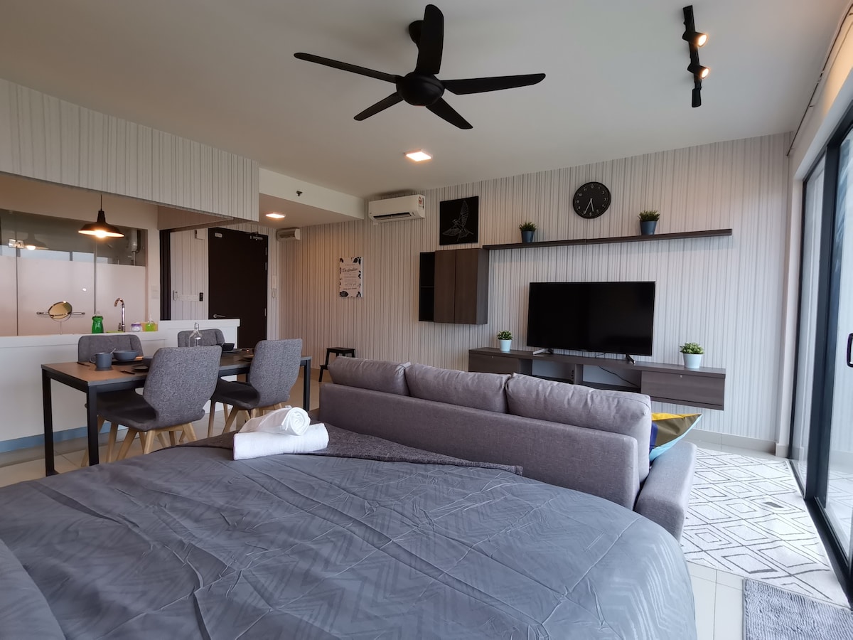 A perfect staycation in an entire studio, which comes with Slumberland president suite king bed and 55 inch smart TV, located in Shah Alam -> Front shoplots have 711, zus coffee, mixue, 99Speedmart, cafe. ->Next to Penisular International School and JsA arena ->800meter to National Institutes of Health(NIH) ->3min drive to Setia City Mall ->5min drive to Setia City Convention Center ->7min drive to Malaysia Longest Night Market(Pasar Malam on saturday) ->20min drive to WaterWorld by i-City