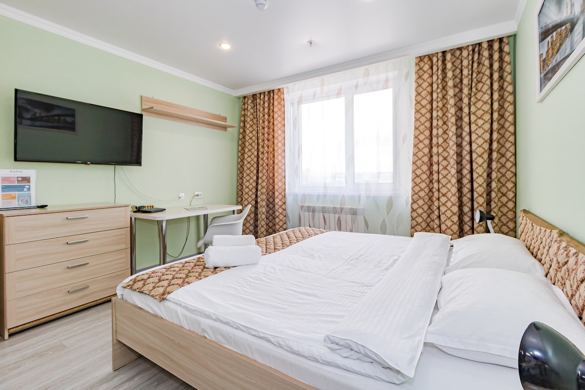 Well furnished 3 apartment rooms in city center with astonishing view to the Botanic Garden and Astana sunset every evening. Rooms are on 12th floor of 23 story Yes Apartment hotel building. There are several well known dining areas, coffee shops, spa center in the hotel to provide services 24/7. All city entertainment venues are in close distance from the hotel. Meals are available and provided upon request for additional charges.