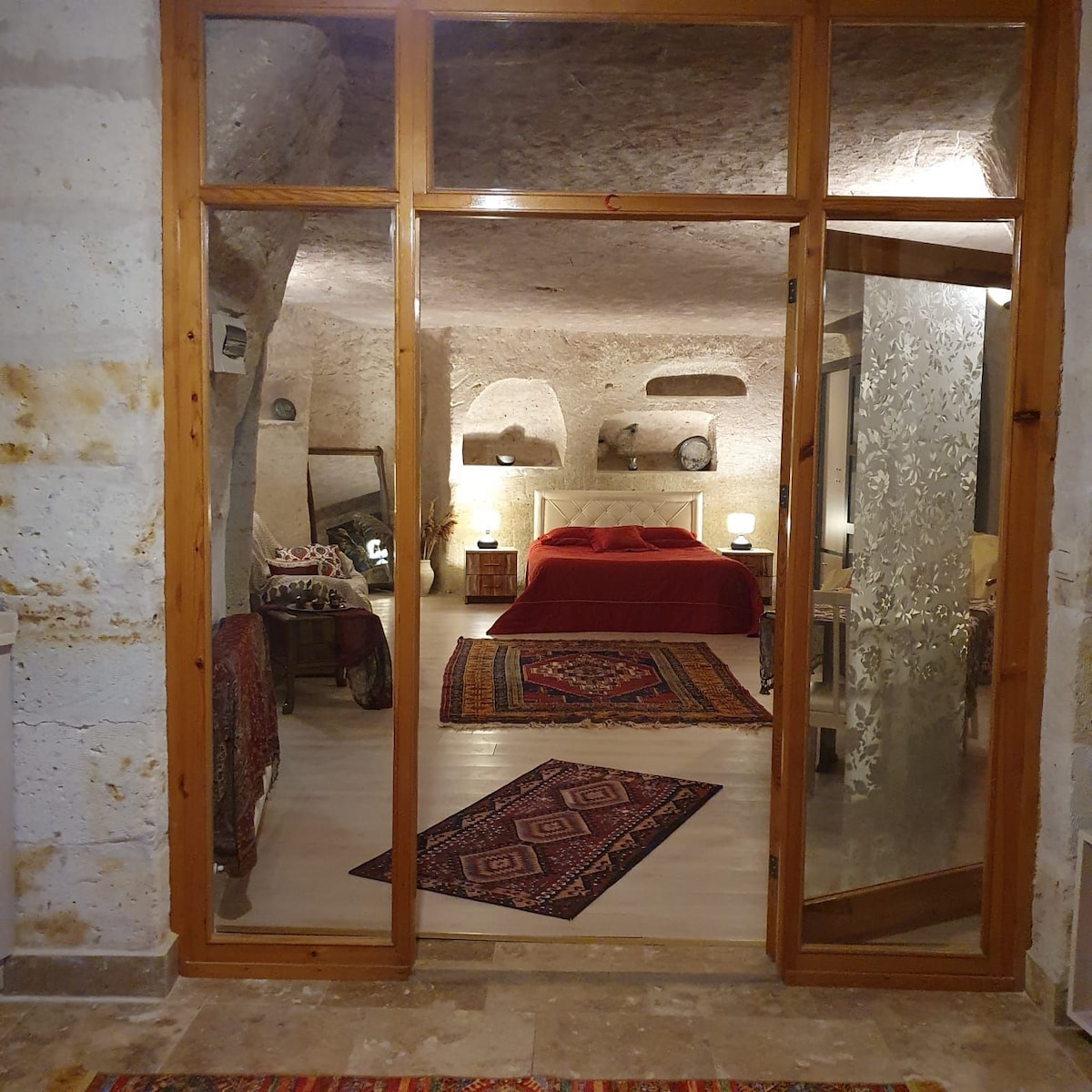 Türk üslubuna olan sevgidən və müasir dizaynın rahatlığından ilhamlanan binamızda 3 səviyyə və iki mənzil var. Üstüaçıq daş mənzil işıqlı və havalıdır, kraliça ölçülü geniş yataq otağı, çıxarış elementləri olan geniş salondur. Aşağı mərtəbədəki mənzil mağaranın içərisində yerləşir. Burada kraliça ölçülü yataq otağı və ikiqat duş/çanaq var. Hər iki mənzildə tam özülü olan mətbəx/yemək sahəsi və terras var. Kapadokyadan zövq aldıqdan sonra açıq havada yemək və kənd ab-havasını oyatmaq üçün mükəmməldir.