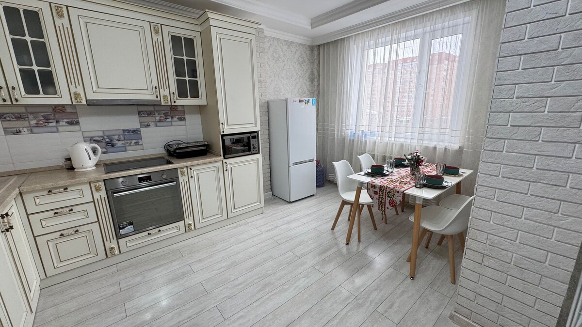 Yeni yaşayış kompleksində yeni, işıqlı və təmiz 3 otaqlı mənzil, mətbəx-studiya. Rahat mövqe 5 dəqiqə Mega Center Alma-Ata, Birinci Prezident Parkına 10 dəqiqəlik məsafədə. Yaxınlıqda mağazalar, gözəllik salonları, qəhvə dükanları, restoranlar, bankomatlar var. Mənzildə rahat qonaqlama üçün bütün imkanlar var: - Yataq dəsti, başmaq və dəsmalları təmizləyin - İki çarpayı: ikinəfərlik və tək - bütün məişət avadanlıqları və ləvazimatları olan mətbəx - Ağıllı Tv - Wi-Fi - birləşdirilmiş hamam otağı bloku Buxar ütüsü - paltaryuyan maşın