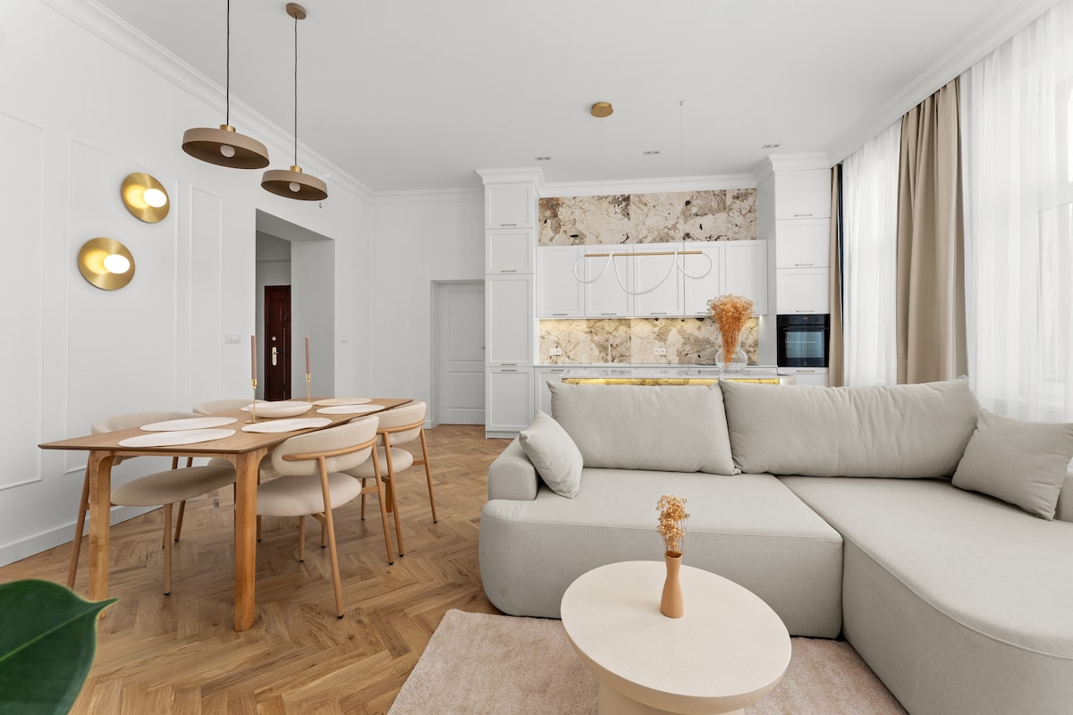 The apartment is set in a beautifully renovated historic townhouse dating back to 1910. Its location is truly special, perfectly positioned between the Old Town and the historic Jewish Quarter, both just a three-minute walk away. You’ll be surrounded by hundreds of cafés, bistros, and bars to explore, while the street itself remains peaceful and quiet. The main train station is just three tram stops away, and the suburban rail station with direct airport connections is within walking distance.
