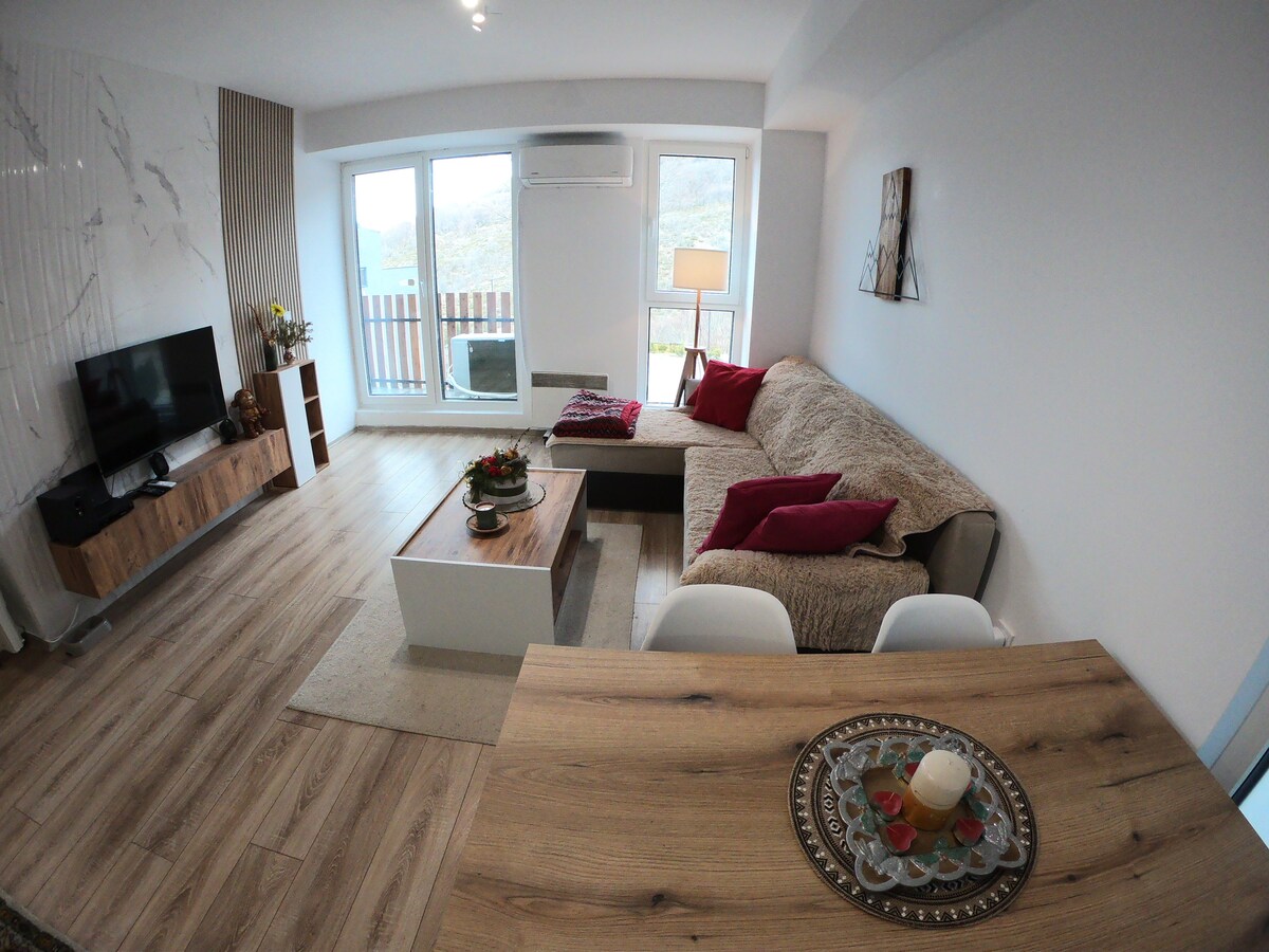 Dinc dağ gəzintinizə xoş gəlmisiniz! Bu rahat mənzil yerli usta dülgərin hazırladığı daş divarlar, taxta tir və unikal mebelin olduğu müasir komfortla rustik cazibədarlığı birləşdirir. Dağlarda ucalan balkon sakitlikdə səhər çayınızdan zövq almaq üçün idealdır. Həmişəyaşıl meşə ilə əhatə olunmuş restoranlardan, idman meydançalarından, velosiped cığırlarından və xizək yamaclarından cəmi 10 dəqiqəlik məsafədəsiniz. Bura təbiətsevərlər və macəraçılar üçün ideal istirahət yeridir.