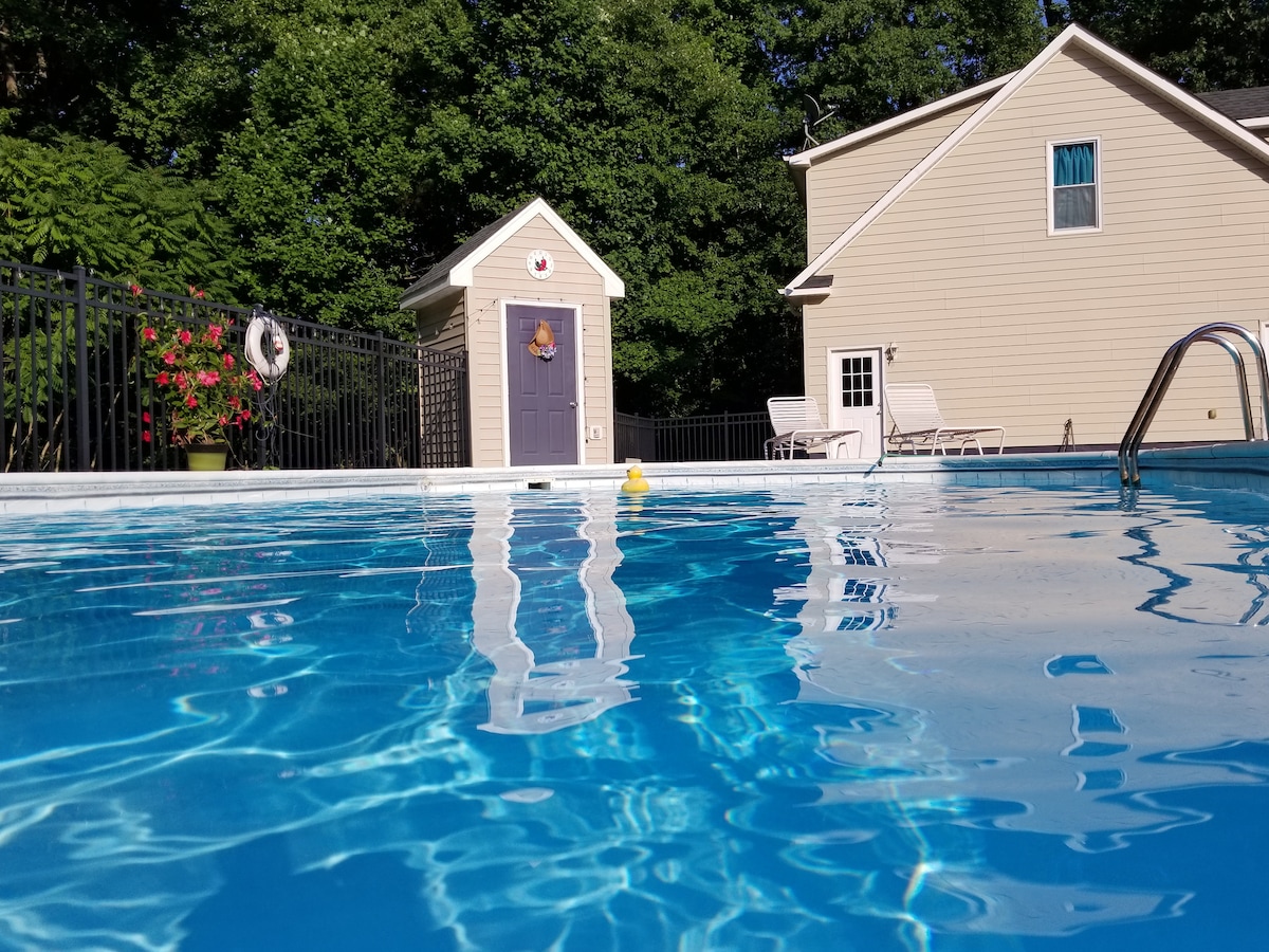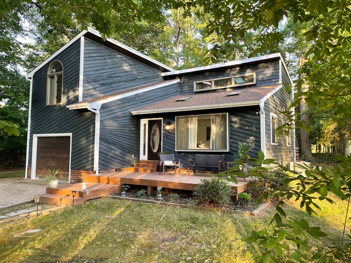 Cute & cozy (tiny) waterfront cottage nestled in a pine forest. Situated on an almost 3 acre point on the Diascund Reservoir this is THE perfect spot to get away from it all & still be in the middle of everything! Options abound - fishing from the dock, bird watching, canoeing, roasting marshmallows around the fire pit, swinging in the hammocks, napping on the screened in porch, grilling on the patio, reading in the loft, playing games (inside & out), or just chill & feel the vibe.
