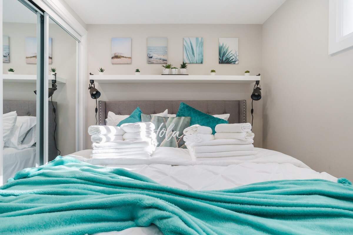 Bu mükəmməl yerdən mağaza, restoran və əyləncələrə asanlıqla giriş imkanından zövq alın. Kanadanın Ecazkarlığı olan Mərkəzi Toronto şəhərinə cəld, rahat nəqliyyatla Qatar və Avtobus Terminalına cəmi 5 dəq. məsafədə və s. Bu aşağı səviyyəli qonaq otağı öz camaşırxanası, mini soyuducusu olan balaca mətbəx, İnduksiya 2 Ocaqlı Aşpaz Üstü Soba, mikrodalğalı soba, toster və qəhvə maşını ilə tam təchiz olunub. Rahat Buxarı, 60" ekranlı HD TV və Lüks Kral Ölçüsü Çarpayı Gəzinti yolları və parkları olan Təhlükəsiz Məhəllə.