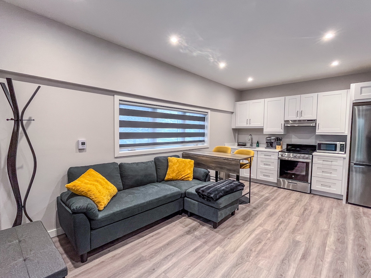 Lower Level Spacious One Bedroom Apartment with private entrance, Free Parking, private washroom, walk in shower, queen bed, sofa Bed which accommodates two extra guest, 55" smart TV with Netflix access, free WIFI, Air Dryer, Iron, Vacuum Cleaner, full Kitchen with stove, coffee maker. NO PET, NO SMOKING, Not Suitable for Children. Complimentary Laundry Access for Guests Staying One Week or Longer.