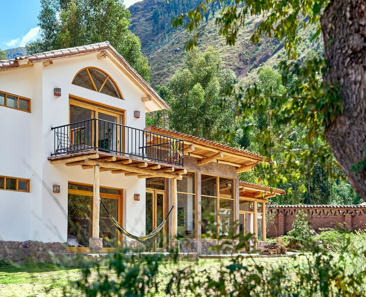 Perched on a scenic slope, this industrial-chic sanctuary offers an ELITE 180° FRONT-ROW SEAT to the Sacred Valley through FLOOR-TO-CEILING GLASS. Tucked within a private condominium of modern homes and neighboring farms. A scenic 10-min walk from the road makes this the perfect elevated retreat for ACTIVE TRAVELERS and MACHU PICCHU explorers. King bed with LUXE LINENS and SPA ROBES. 10min walk to boutique cafes. RELIABLE DRIVERS available for transfers and excursions. Scenic walks.