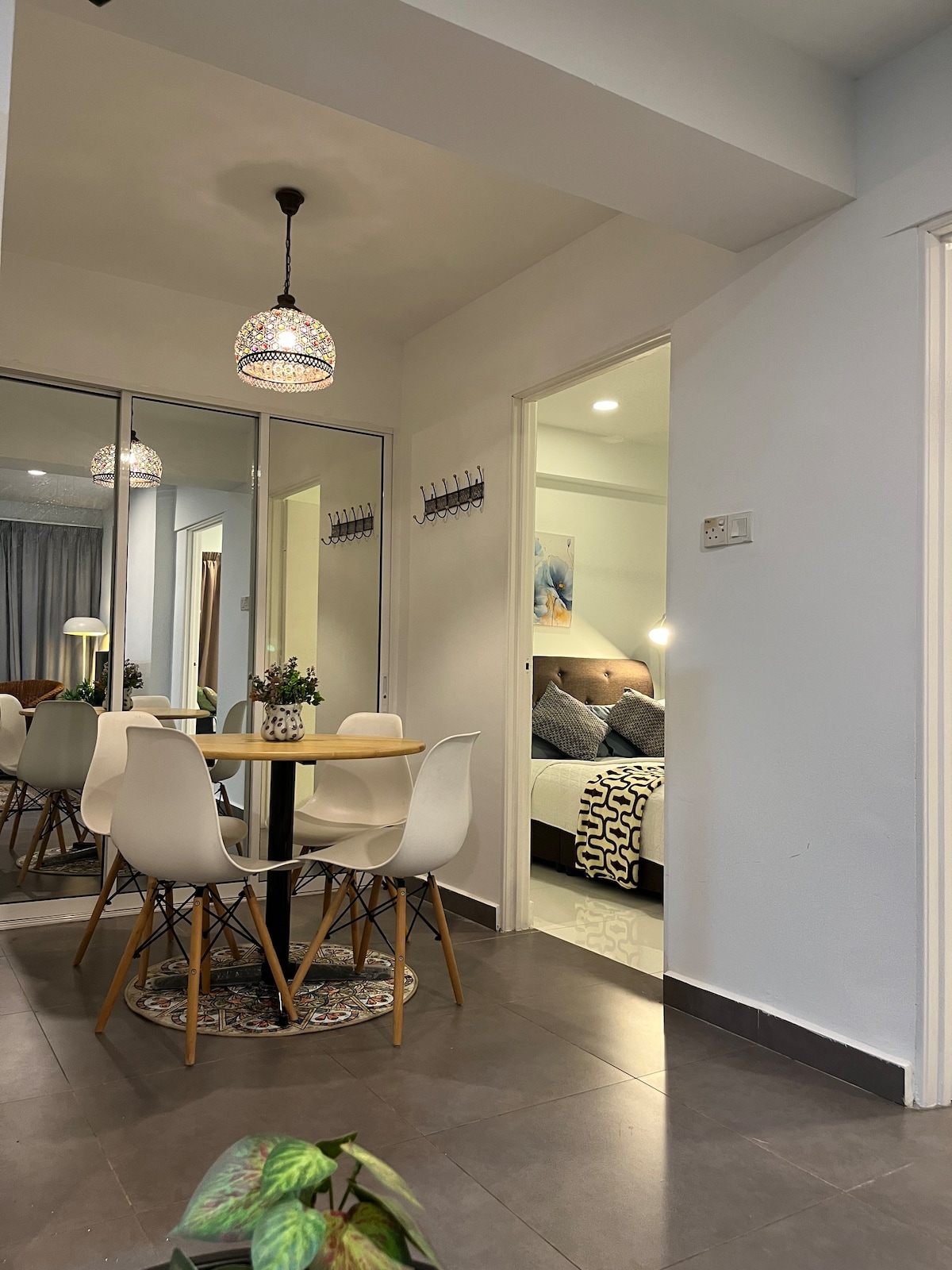 You'll be staying in a penthouse for 2 guests. - Condominium - Top floor with Mountain view - Massage chair for relaxation [Provided] -Wi-Fi 260 Mbps -Office chair -Table -Queen size bed -Filtered Water - Coffee -Toothpaste -toothbrush (cabinet) -Shampoo -Body soup -Ear-cotton [Please note] -Owner stay at the next door. -Grill door n outdoor cctv to ensure safety -Non smoking room -Self cleaning during the stay -Please request cleaning -No washing machine -Laundry (launderette) is nearby