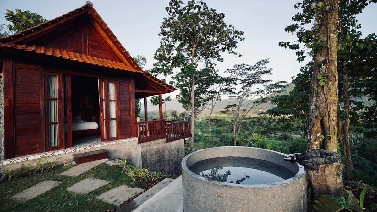 Bali əyalətinin Sidemen şəhərinin mərkəzində qayalıqda yerləşən bu dəbdəbəli bambuk villada təbiətə qaçın. Yerli kafe və imkanlardan qısa məsafədə yamyaşıl düyü terrasları, Aqunq dağı və nəfəskəsici dağ silsiləsi mənzərəsini seyr edin. Şəxsi sonsuzluq hovuzunuzda dincəlin və ya villanın səma damında ulduzlara baxın. İşıqla dolu və təbii materiallardan hazırlanmış bu romantik istirahət məkanı sülh, gözəllik və unudulmaz günəş doğuşu axtaran cütlüklər üçün mükəmməldir.