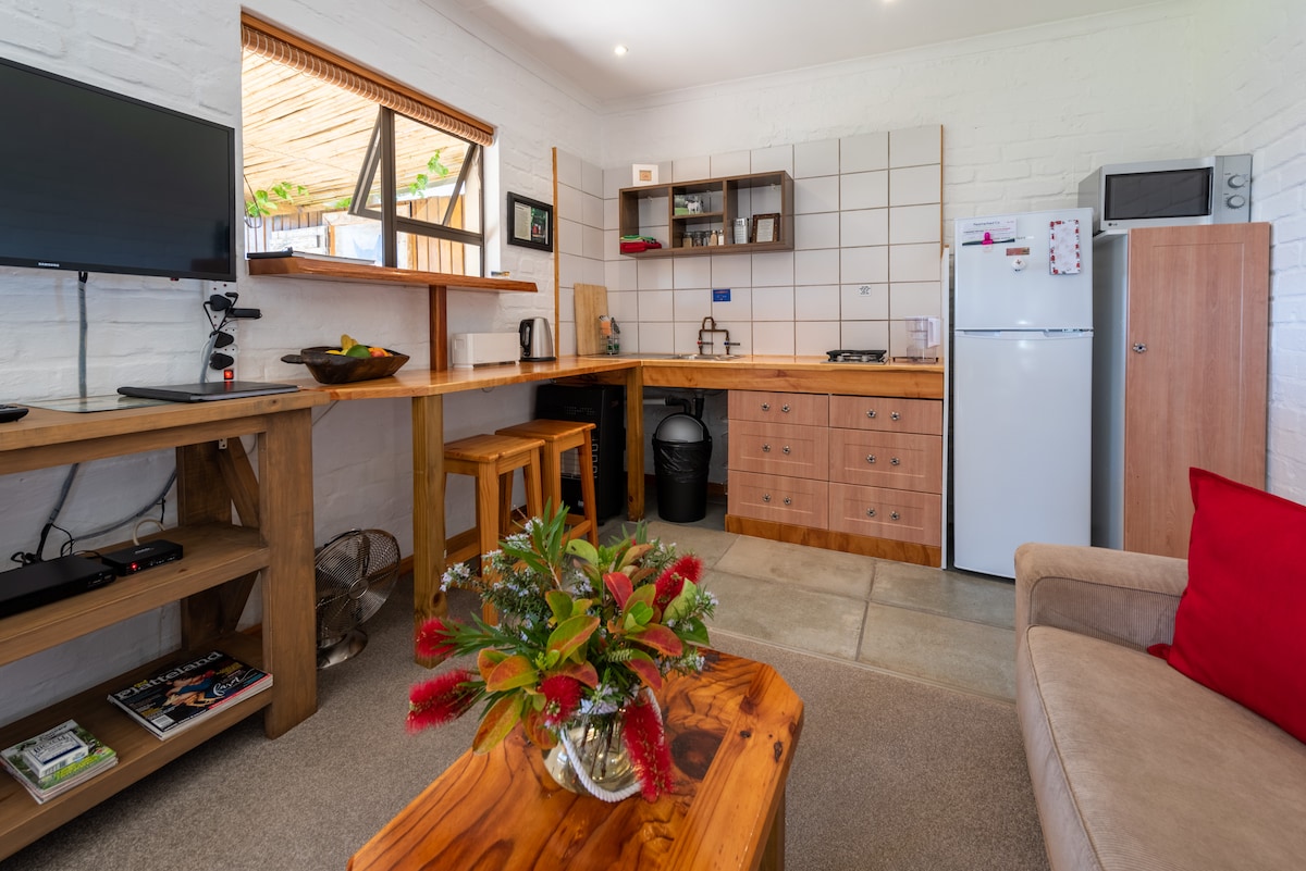 SUPER EV SAHİBLƏRİ ilə əsl AIRBNB təcrübəsi. Studiya 1, KING ölçülü çarpayı və tək çarpayı, kiçik bir hamam otağı və kiçik ayrıca mətbəx/yemək sahəsi, veranda və braai sahəsi olan 3 rahat ÖZÜNÜ TƏMİN EDƏN studiyadan biridir. Həmçinin Peyk televizoru və sürətli lifli Wİ-Fİ və pulsuz səhər yeməyi qidaları. Studiadan haliçin heyrətamiz mənzərəsi açılır və o, çoxsaylı xüsusi mağaza və restoranları ilə məşhur Knysna Quays sahilyanı ərazisindən cəmi 1,4 kilometr məsafədə yerləşir. İndi bron edin !!!!