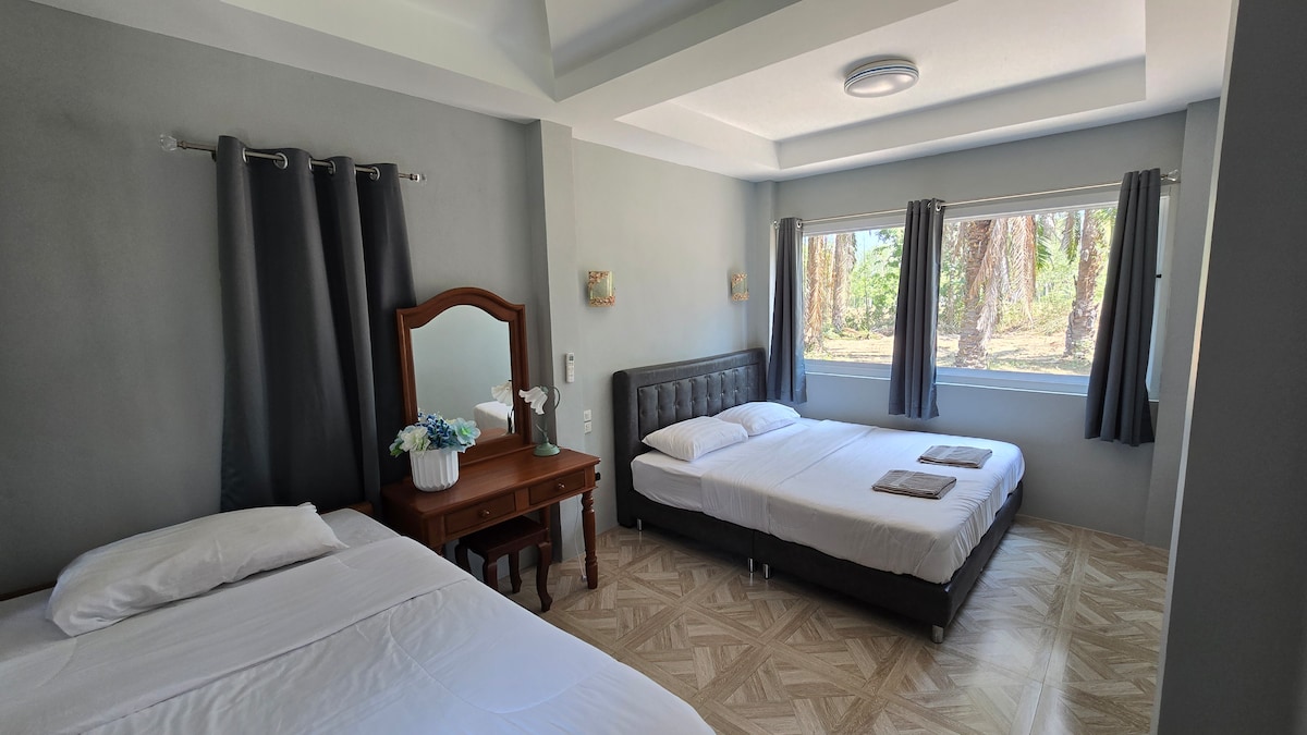 Uzaqdan iş üçün uyğundur: iş masası, 600×600 Mbit/s sürətli fiber optik Wi-Fi, iki səssiz kondisioner, smart TV, ayrıca tik taxtasından hazırlanmış terras və induksiya plitəsi olan kiçik mətbəx. Sakit, müasir, minimalist, təbiətə yaxın. Xlonq Çak Çimərliyinə 10 dəqiqədən az müddətdə piyada gedin; araşdırmaq üçün skuter/taksi tövsiyə olunur. Bu bron Cascade Hills Bungalowdakı B (orta) mənzil üçündür.