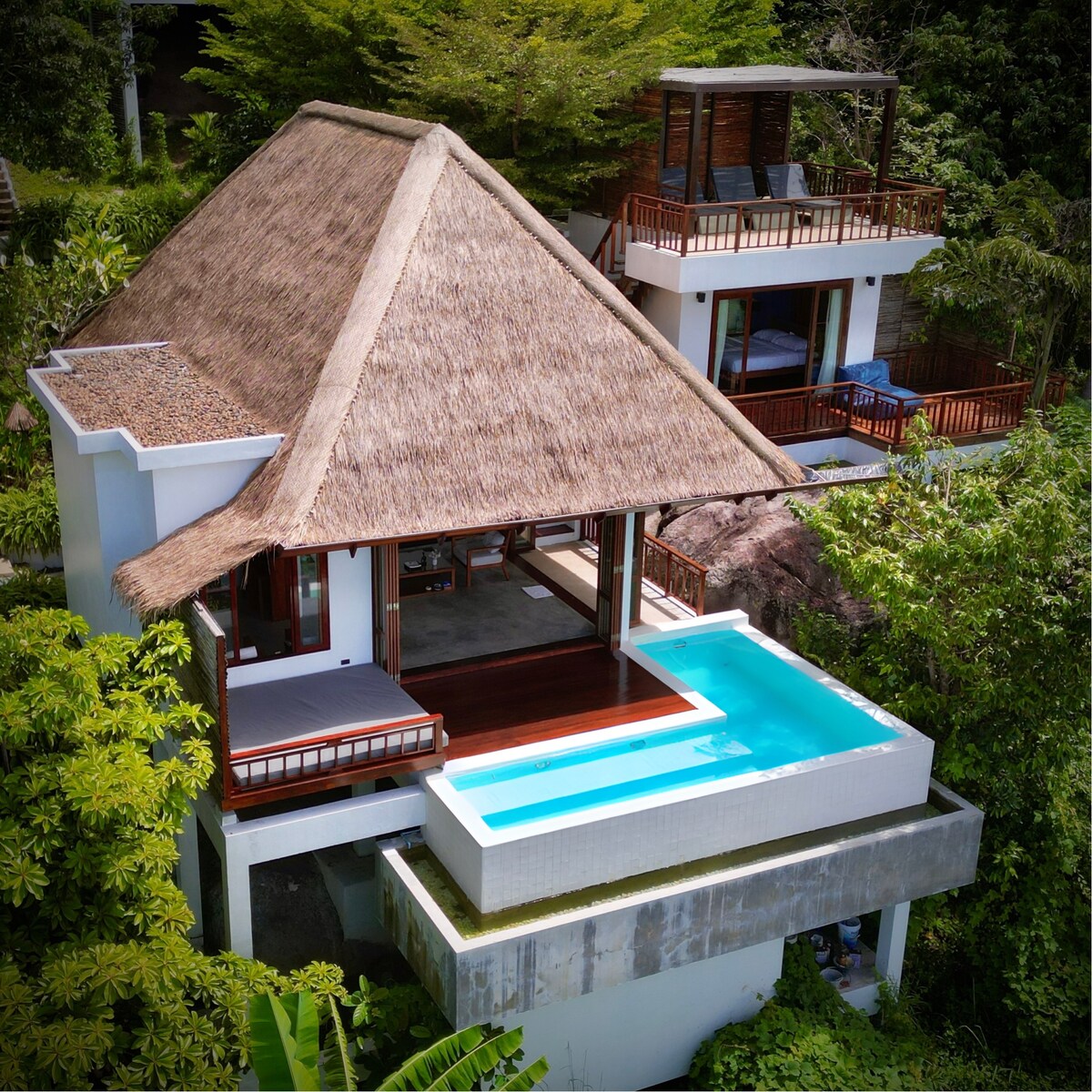 Koh Tao təpəsində qurulmuş Phandara 2 otaqlı villa. Ailələr və ya dost qrupları üçün ideal olan bu villa böyük üzgüçülük hovuzu və istirahət üçün gözəl dekorasiya sahəsi olan geniş və rahat qonaqlama təklif edir. Villanın mərkəzində tam təchiz olunmuş mətbəx və qonaq otağı var, yeməklərdən zövq almaq və birlikdə vaxt keçirmək üçün mükəmməldir. Hər bir yataq otağı kondisionerlidir və rahat gecə yuxusunu təmin edir. Çöldə sakit cəngəllik mühitində heyrətamiz dəniz və qürub mənzərələrindən zövq ala bilərsiniz.