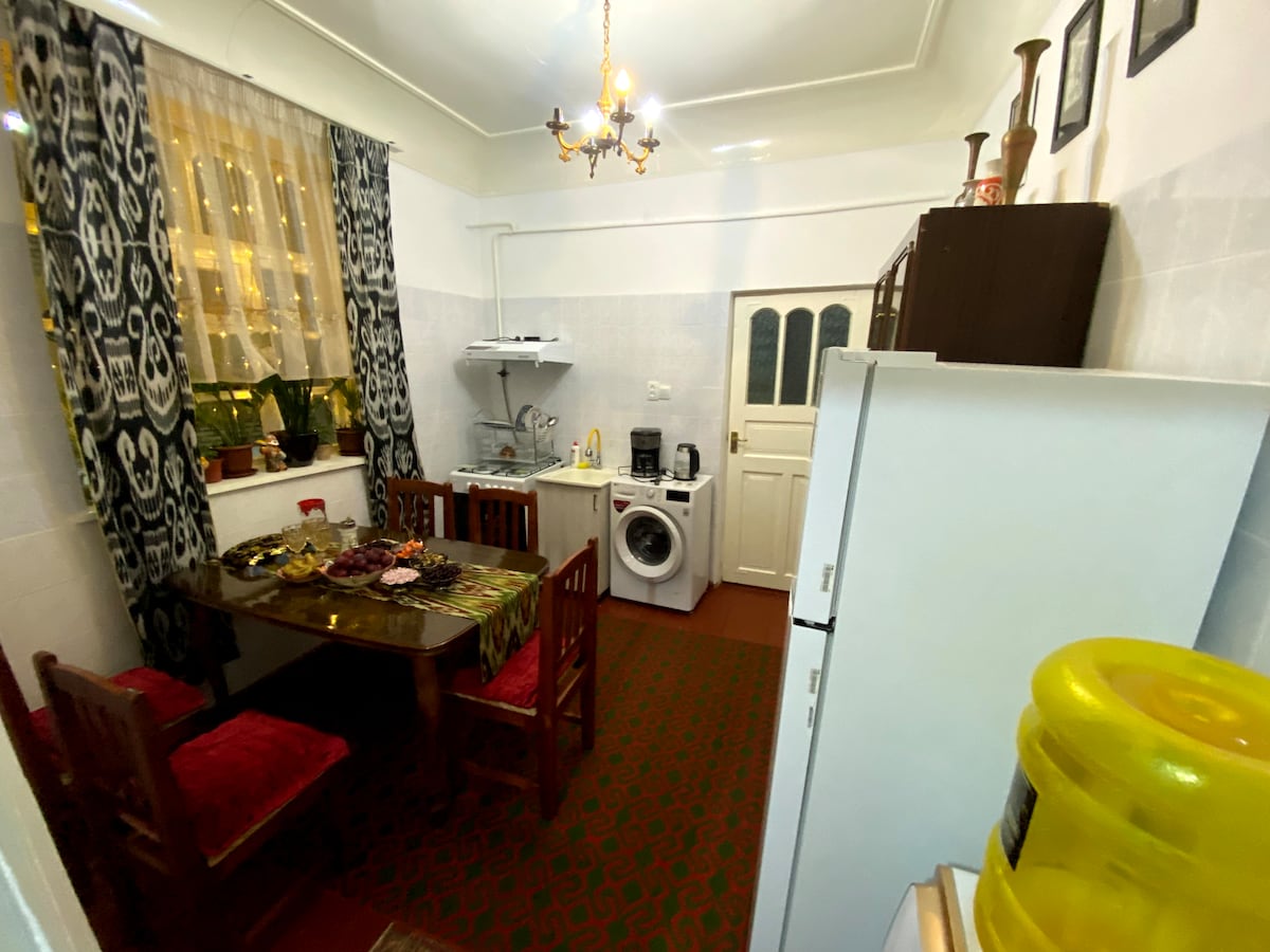 Buxaranın tarixi mərkəzindən bir neçə dəqiqəlik məsafədə yerləşən bu geniş və rahat evdə qonaqlayın. Kondisionerli yataq otaqları, işıqlı qonaq otağı, tam mətbəx, geniş dəhliz və ayrıca hamam və tualet ilə ailələr və dostlar üçün mükəmməldir. Pulsuz parkinq, sürətli Wi-Fi və asan öz-özünə giriş/çıxış mövcuddur. Maksimum 6 qonaq yerləşdirir (5 çarpayı + divan çarpayı). Şəhərin ən böyük ticarət mərkəzi, kafe, bazar və supermarketlərinə yaxın İçəri Şəhərə cəmi 10 dəqiqəlik məsafədə.