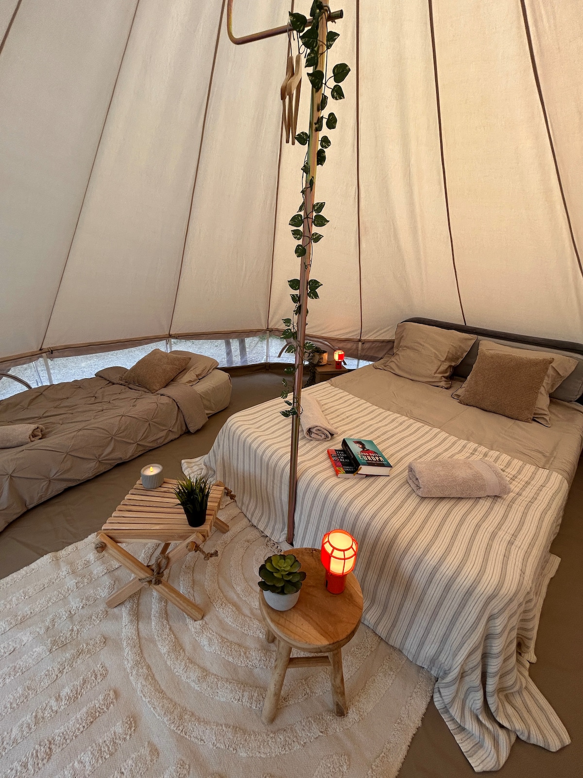 Uniek overnachten vlak bij het strand! Op ons terrein verhuurt ons jonge gezin met 4 kids een sfeervol ingerichte Bell tent. Wordt wakker met het gemekker van Nora het schaap 🐑 en het gekraai van Harrie de Haan! Geniet van het weidse uitzicht, een knisperend kampvuur en een luxe badkamer. Relax in onze Finse kota en maak gebruik van een koelkast en koffiemogelijkheden. Extra genieten? Huur de hottub en/of onze nieuwe houtgestookte sauna (2026). Vraag naar de mogelijkheden!