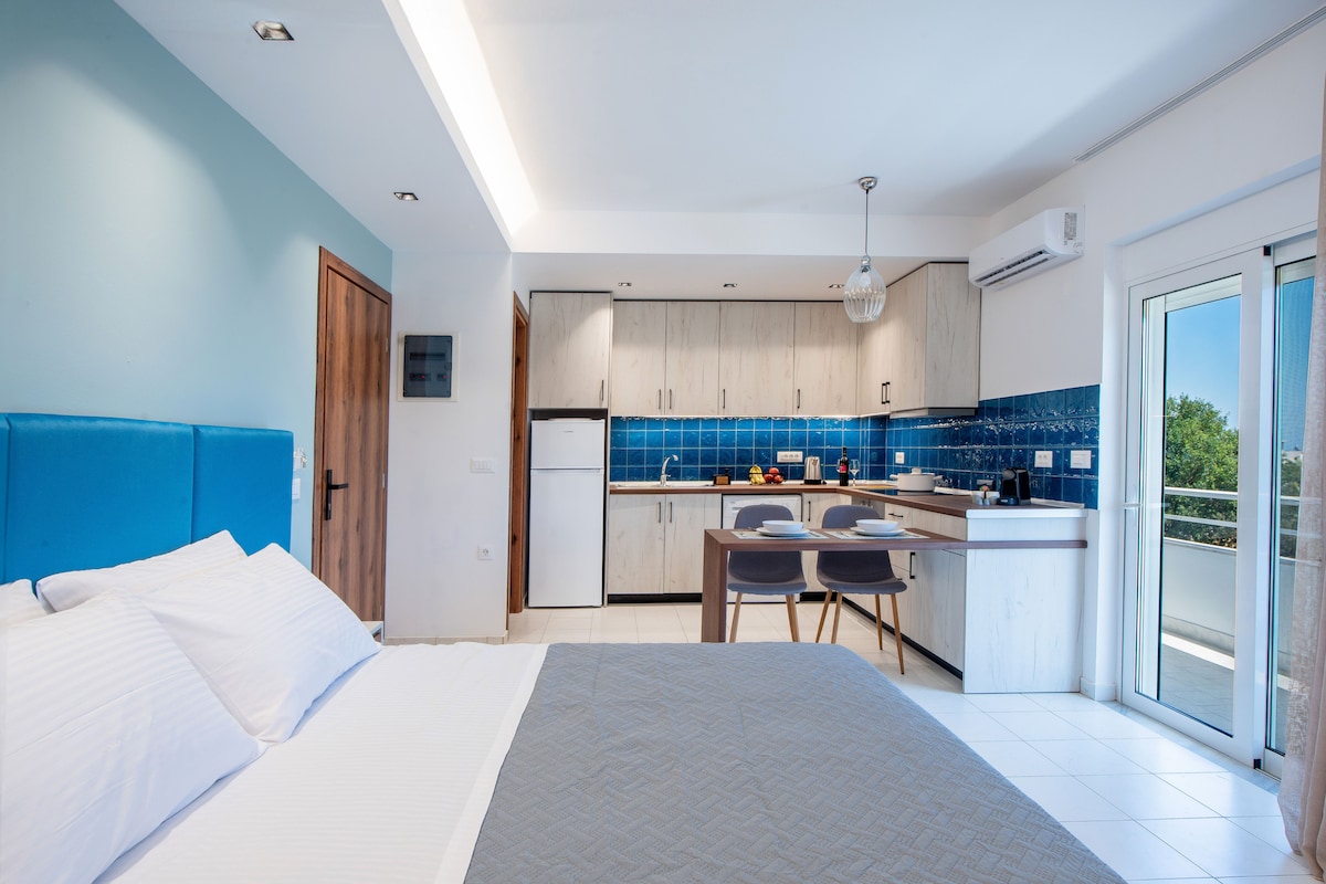 Απολαύστε την απόλυτη χαλάρωση σε αυτό το κομψό και πλήρως εξοπλισμένο στούντιο με μαγευτική πανοραμική θέα στη θάλασσα. Το διαμέρισμα διαθέτει ένα άνετο διπλό κρεβάτι και καναπέ-κρεβάτι, ιδανικό για να φιλοξενήσει έως 3 άτομα. Η ιδιωτική αυλή με σαλόνι εξωτερικού χώρου σας προσκαλεί να απολαύσετε τον καφέ ή το κρασί σας με θέα το απέραντο γαλάζιο. Ιδανικό για ζευγάρια, φίλους ή οικογένειες που αναζητούν πολυτελή διαμονή με άνεση και στυλ, μακριά από τον θόρυβο της πόλης.