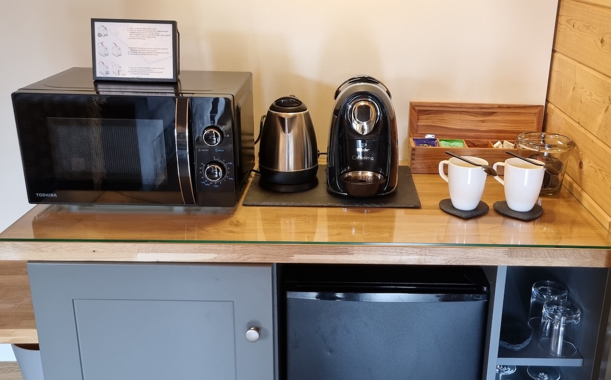 Kottecin birinci mərtəbəsində iki otaq və böyük bir qonaq otağı, duş kabinəsi olan hamam və tam təchiz olunmuş mətbəx var. Qonaqların eksklüziv istifadəsinə verilən sauna və meşəyə baxan bağ balyası olan geniş terrasda barbekü çox zövq verməlidir. SPA zonası məxfiliyi qorumaq üçün yerləşdirilib və qonaqlar özlərini narahat hiss etmirlər. Kottec kondisionerlə istiləşdirilir və göl və çimərliyə yaxındır