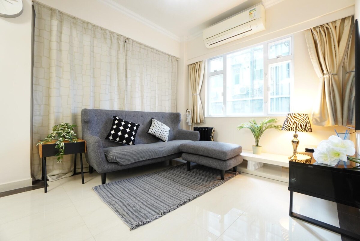 Large, modern, stylish, newly renovated deluxe 2 bedroom apartment (900 sqft) conveniently located just 5 mins walk from MTR station & 15 mins from Wanchai & Central. Situated in a popular neighbourhood with excellent transport links, and easy access to supermarkets, restaurants & shops - all within 5 mins walk. 2 bedrooms with 1 Queen Bed, 2 elevated single beds + 1 airbed. Fully furnished with hi-speed Wi-Fi, AC, well equipped western kitchen & large swimming pool and sauna all year round.