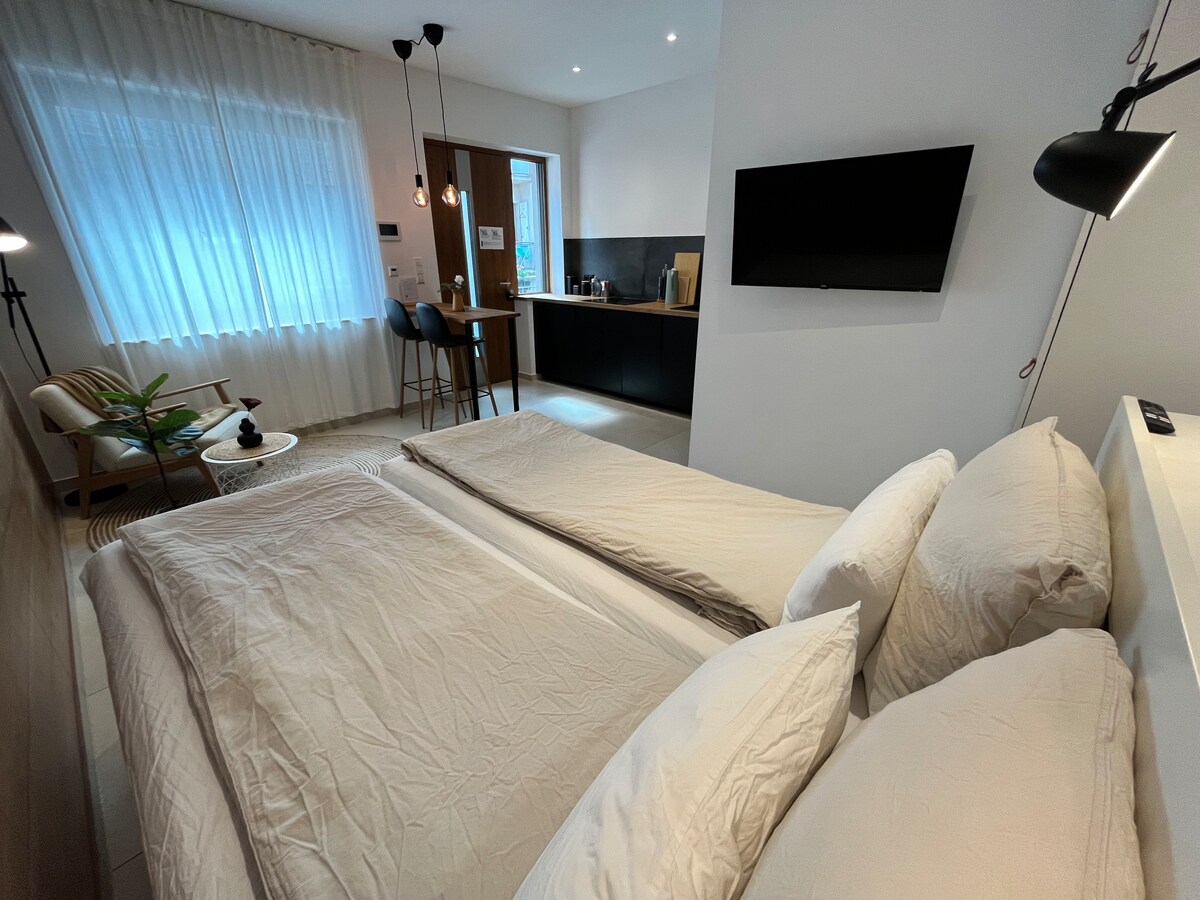 Our five newly built, side-by-side studio apartments are modern, featuring underfloor heating, a combined living/sleeping area, and an open kitchen. Each apartment includes a separate bathroom with a large rain shower, plus a table and two chairs outside. Shared amenities include Wi-Fi, washing machine, dryer, and gym. Welcome gifts, coffee, tea, spices, towels, bed linen, and toiletries are all provided.