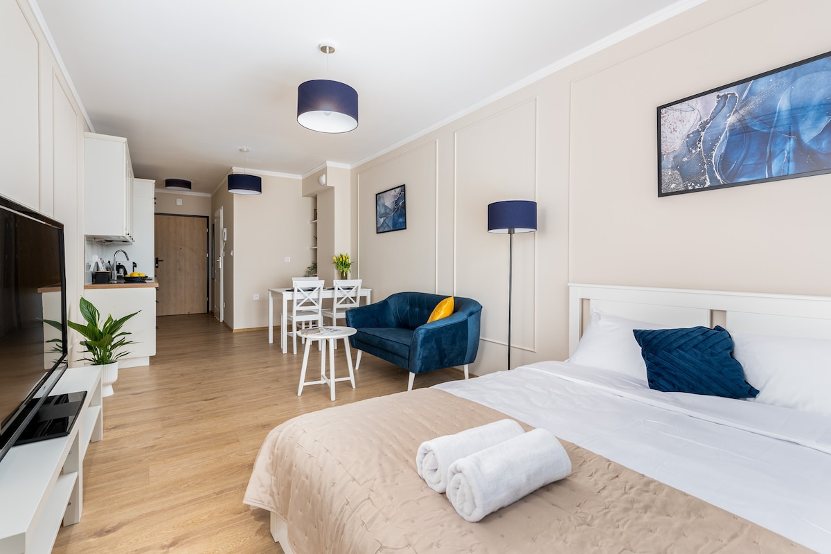Stylish studio with balcony - situated on first floor, in the heart of famous Jewish Quarter – Kazimierz, the center of the cultural and amusement life in Krakow. Its central location provides easy access to tourist attractions such as the Main Market Square and Wawel Castle. Being situated in the heart of Kraków ensures convenient access to various restaurants, cafes, and shops. The vibrant atmosphere of the neighborhood allows guests to experience the local culture firsthand.
