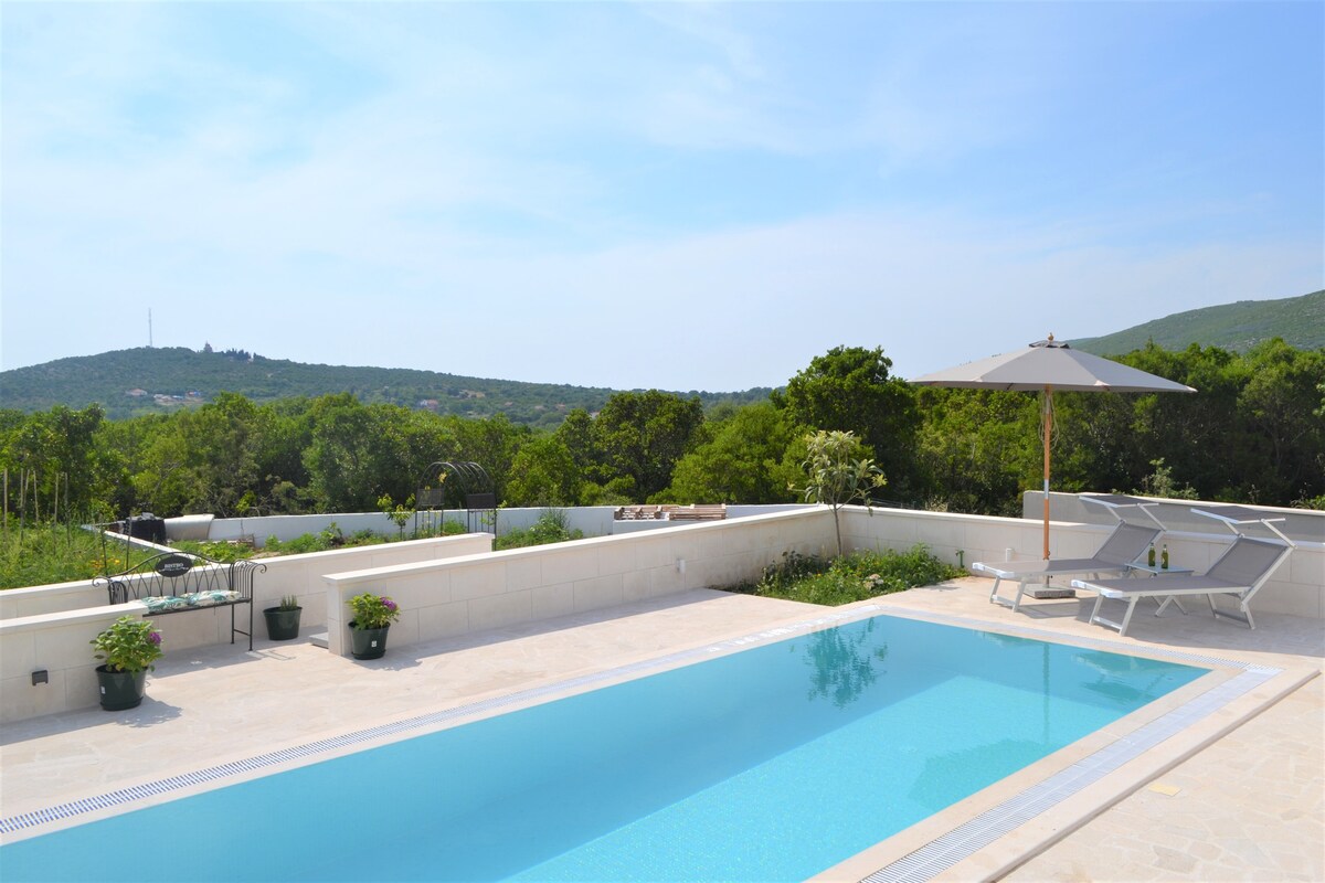 Discover a unique, newly built hilltop villa with breathtaking views of the sea, mountains, and forest. Just 5 minutes from stunning beaches and great local restaurants. The villa features 3 separate apartments, each with its own bathroom, fully equipped kitchen, and dining area. Enjoy the cozy rooftop lounge, a spacious pool with comfy sunbeds, and private parking for up to 3cars. Ideal for families, groups or couples seeking peace, comfort, and natural beauty.