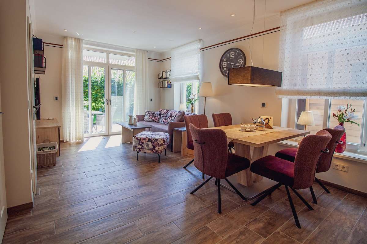 The holiday home "Up Besöök"was rebuilt in 2020 in the quaint town center of the Warfendorf Upleward. The house is equipped with a smart home system, which makes the vacation even more pleasant and interesting.The " Magnolie" apartment is on the ground floor ofthe house and offers very high qualityfurnishings. The living and dining area offers space to cook and eat together or relax on the comfortable sofa with a good book or a nice movie on the OLED SmartTV.When the weather is nice, you can enjoy yourself on the sunny terrace, which can be accessed directly from the living room. Furthermore, the highlight ofthe apartment is in the garden , a private Swedish sauna. So you can warm up in your private wellness oasisafter a winter walk in the cold season. The apartment offers 2 bedrooms, one with a double bed (160x200)and one with two single beds (90x200). Both bedrooms are equipped with a Smart TV, wardrobeand extra large duvets (155x220). In the bedroom with a double bed, electrically adjustable slatted framesoffer the desired level of comfort.The bathroom in the Wildrose apartment has a walk-in shower, hairdryerand heated towel rail. A washer-dryeris also available in the apartment. A parking spaceis available for you free of charge directly at the house, and bicyclescan also be safely parkedand chargedin a separate bicycle shed. The "Up Besöök" is located in the Krummhorn village of Upleward, from here it is only 2 km to the dry beach, there is a swimming areabehind the dikeand a nice playgroundfor children. For more information about Upleward and the Krummhörn, please clickde/de/1861791/upleward"> here.