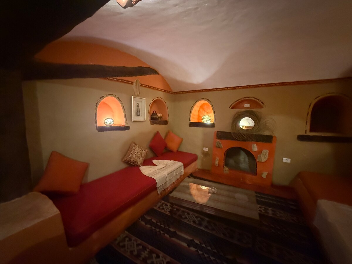 Plongez dans l'histoire de ce logement inoubliable. Une Suite troglodyte premium au cœur du ksar, idéale pour familles/groupes jusqu’à 5 pers. Espace nuit modulable (lit double ou jumeaux) + salon. 2 salles de bain pour plus de confort. Bonus rare : spa hammam troglodyte privé. Décor “musée” (tableaux & pièces anciennes). Restaurant à la carte, café, salon cheminée, cour, BBQ et repas extérieur. Petit-déj buffet inclus.