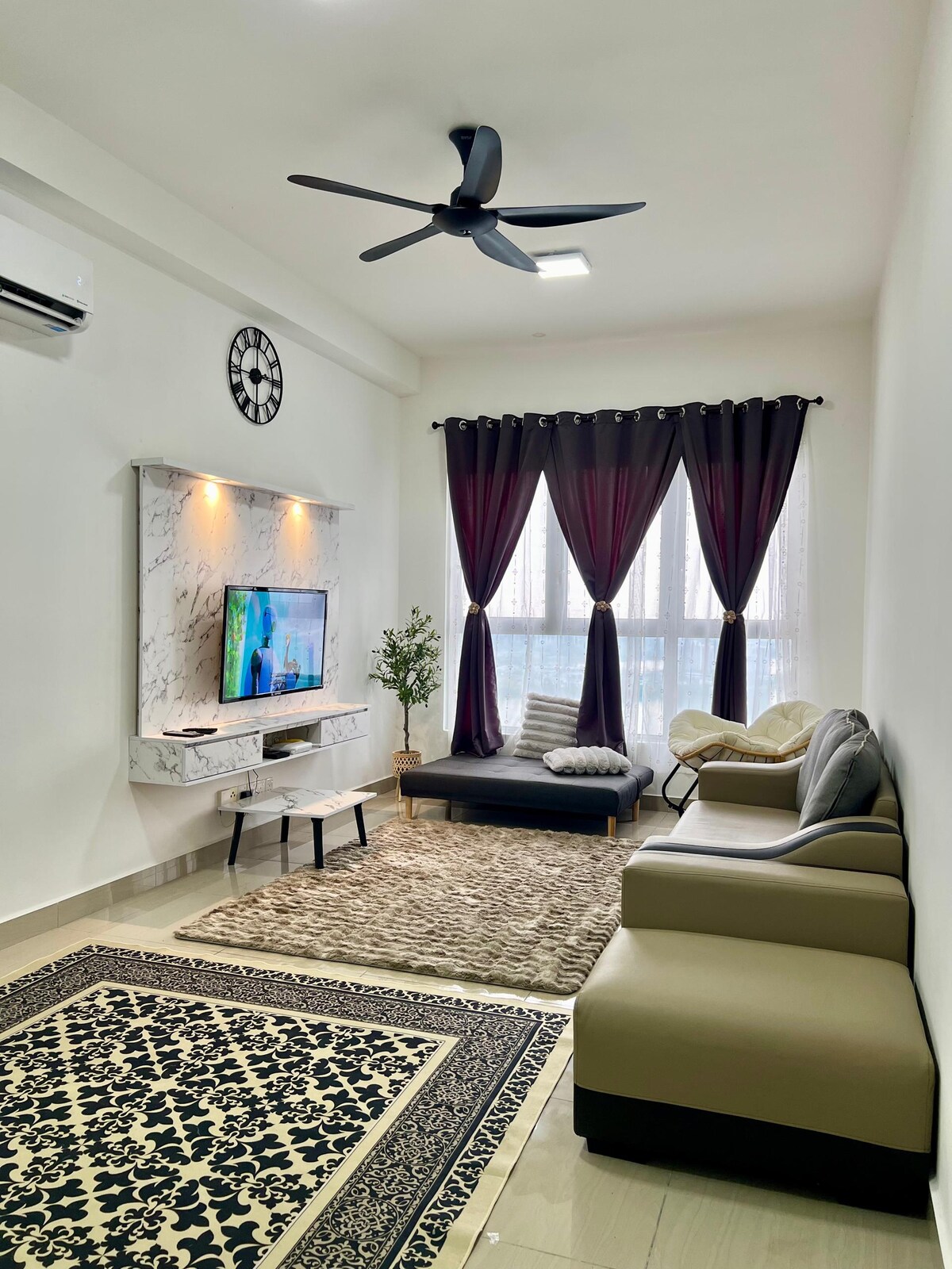 StarSuiteAC – Buludların üstündə lüks qonaqlama! Yüksək mərtəbədə dəbdəbəli dizaynlı dupleks, KL səma xəttinin valehedici bulud-karpet mənzərəsini təklif edir. Ulduzlu tavan kimi qalaktikanın altında dincəlin və digərləri kimi bir tətil yaşayın! Səs keçirməyən karaoke otağı, bilyard və hava xokkeyindən və əsl film təcrübəsi üçün ətrafdakı səsə malik ev kinoteatrından zövq alın. İmkanlar: mətbəx, soyuducu, mikrodalğalı soba, plov bişirən, hava fritözü, su filtrləri, paltaryuyan maşın (quruducu ilə), masaj kreslosu və s.