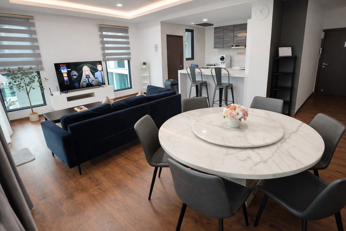 Welcome to Modern Suites @ Jazz Suites, Vivacity! Experience the best of city living in this modern, spacious 3 bedroom apartment designed for comfort and style. Perfect for families or groups up to 8 guests, this urban retreat offers a relaxing stay with breathtaking city skyline views. Central location with easy transport access. Jazz Suites is on top of Vivacity Megamall, the largest shopping mall in Sarawak and definitely a shopping heaven!