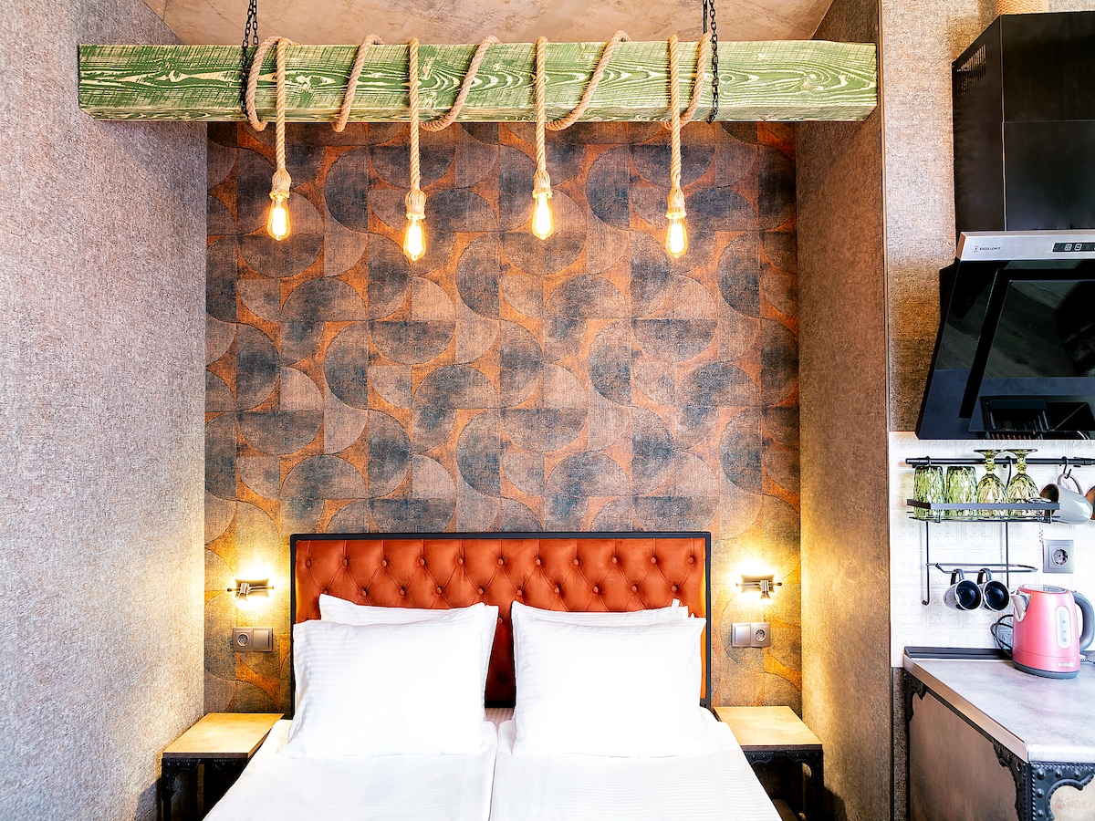 Şəhərin mərkəzində yeni otel tipli otaqlar. Hamam otağı ilə. Kiçik soyuducu, çaynik, fen var. Mətbəx yoxdur. Ağıllı TV, sürətli internet Paltaryuyan maşından quruducu ilə istifadə edə bilərsiniz. Buradan Tbilisinin bütün görməli yerlərinə gedə bilərsiniz. Gözəl Şərab fabrikinə qarşı bir çox dəbli kafe restoranları və barları, banklar, supermarketlər, gözəllik salonları var