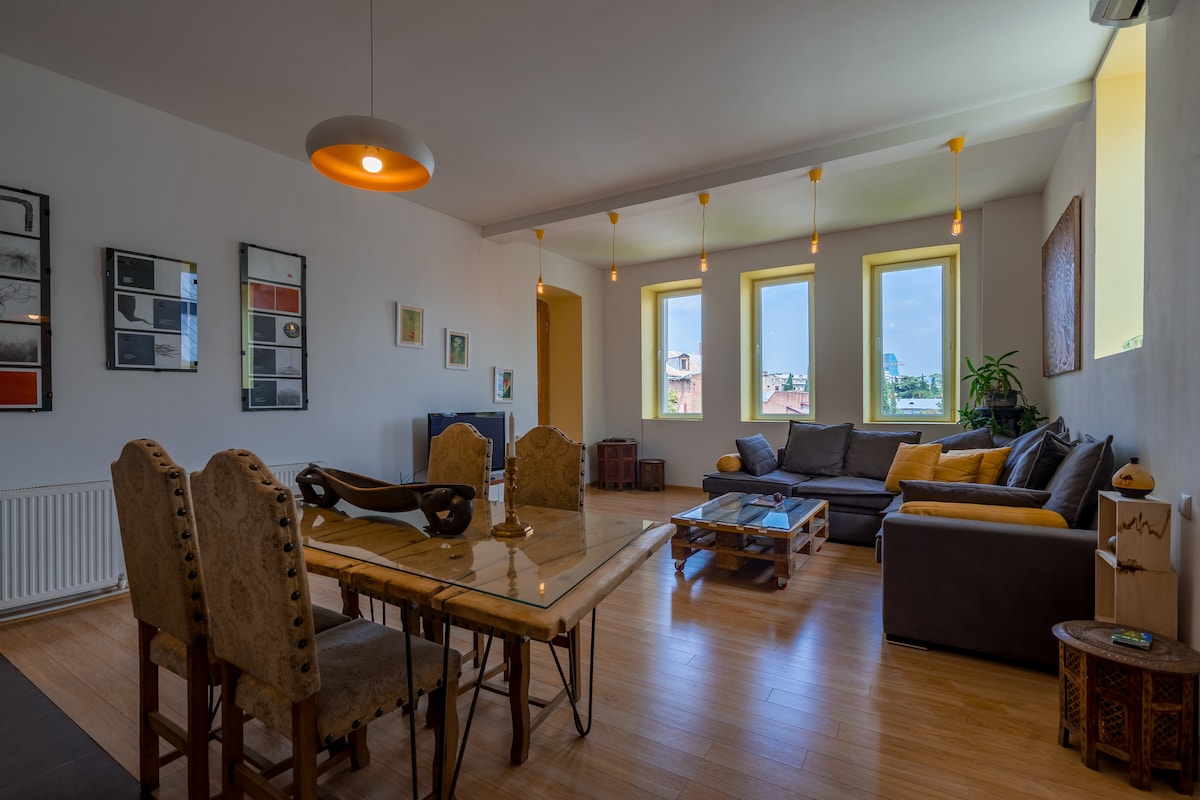Pəncərədən Mtatsminda dağlarının heyrətamiz mənzərəsi açılan bu parlaq və dəbli iki yataq otaqlı loftda Köhnə Tiflisin cazibəsi ilə oyanın. Ən orijinal və tarixi məhəllələrdən birində yerləşən mənzildə müasir rahatlıq və ənənəvi gürcü atmosferi mükəmməl şəkildə birləşir. Evdə bişirilmiş yeməklər üçün tam təchiz olunmuş mətbəx. Rahatlıq və üslubdan zövq alaraq Tbilisi ruhunu yaşamaq istəyən cütlüklər, ailələr və ya dostlar üçün mükəmməldir.
