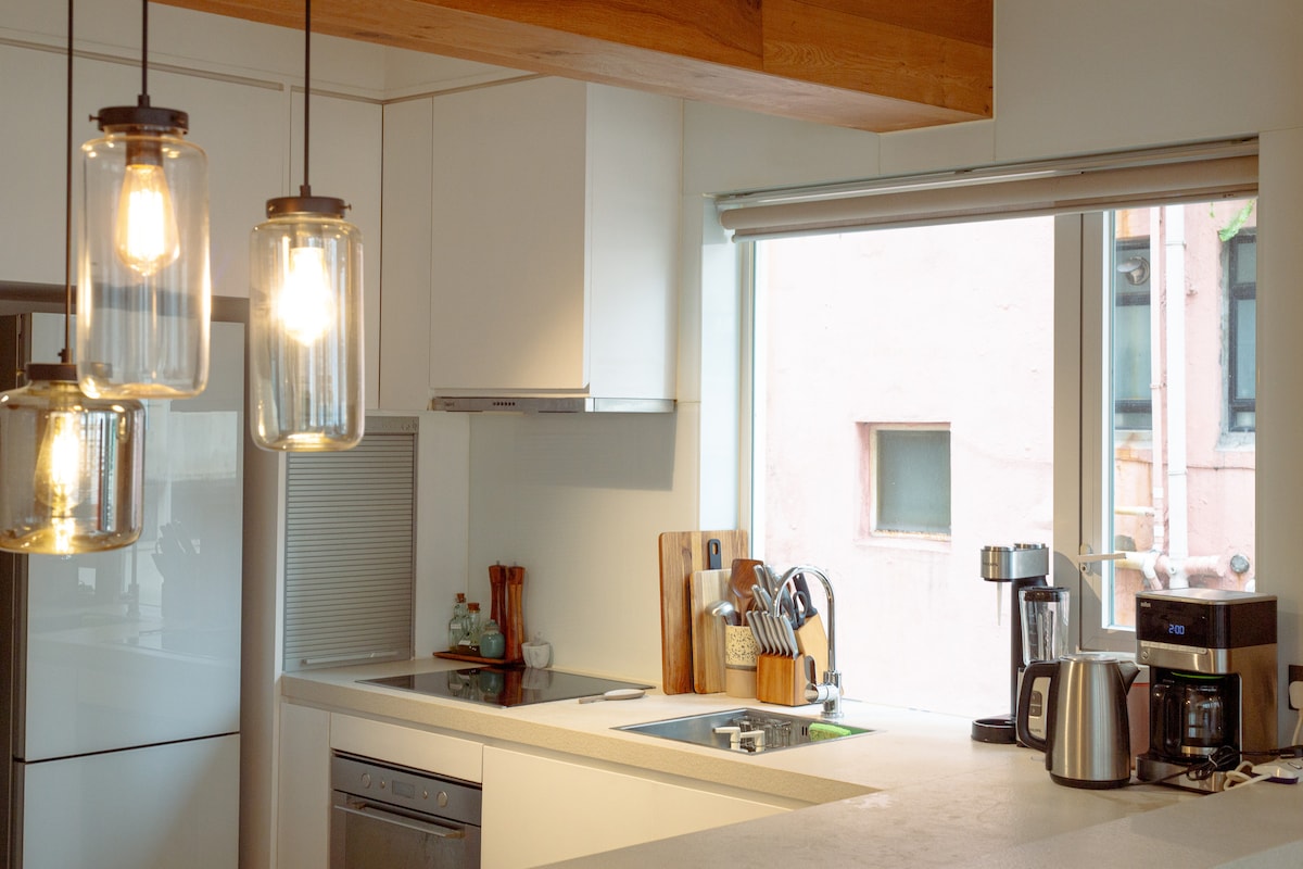 Dəbli Kennedi Şəhərində müasir dəniz mənzərəli mənzil - Mərkəzdən cəmi 15 dəqiqəlik məsafədə. Tam mətbəxi (soba, qabyuyan maşın, paltaryuyan/quruducu) və gün batımı axşamları və Disneyland atəşfəşanlığı üçün mükəmməl nadir xüsusi verandası olan geniş 1 yataq otağı. Bütün otaqlar heyrətamiz dəniz mənzərələrindən zövq alır. MTR-yə piyada 3 dəq, tramvaya 1 dəq, liman sahilindən qaçış cığırına və Honq Konq adası yürüyüş cığırına piyada 10 dəq. Əla kafe və restoranları olan sakit, təhlükəsiz məhəllə. Honkonqu araşdırmaq üçün mükəmməl baza.