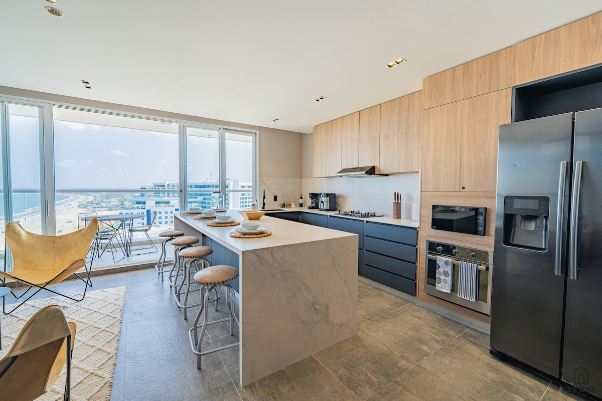 🌅Top 1% Airbnb en Morros Epic Cartagena. Moderno diseño frente al mar para 4 personas (cama king+sofá Queen). CONFORT: aire acondicionado, cocina equipada, balcón con vista a piscinas y mar. TRABAJO: wifi fibra óptica y escritorio. Workation SEGURIDAD: cerradura inteligente 24/7. AMENIDADES: 4 piscinas, gym, jacuzzi, baño turco, salida directa a la playa. RNT 241622. Cerca de aeropuerto y centro histórico. El edificio cobra manilla por $20.000 COP por huéspedes mayores de 5 años, por estancia