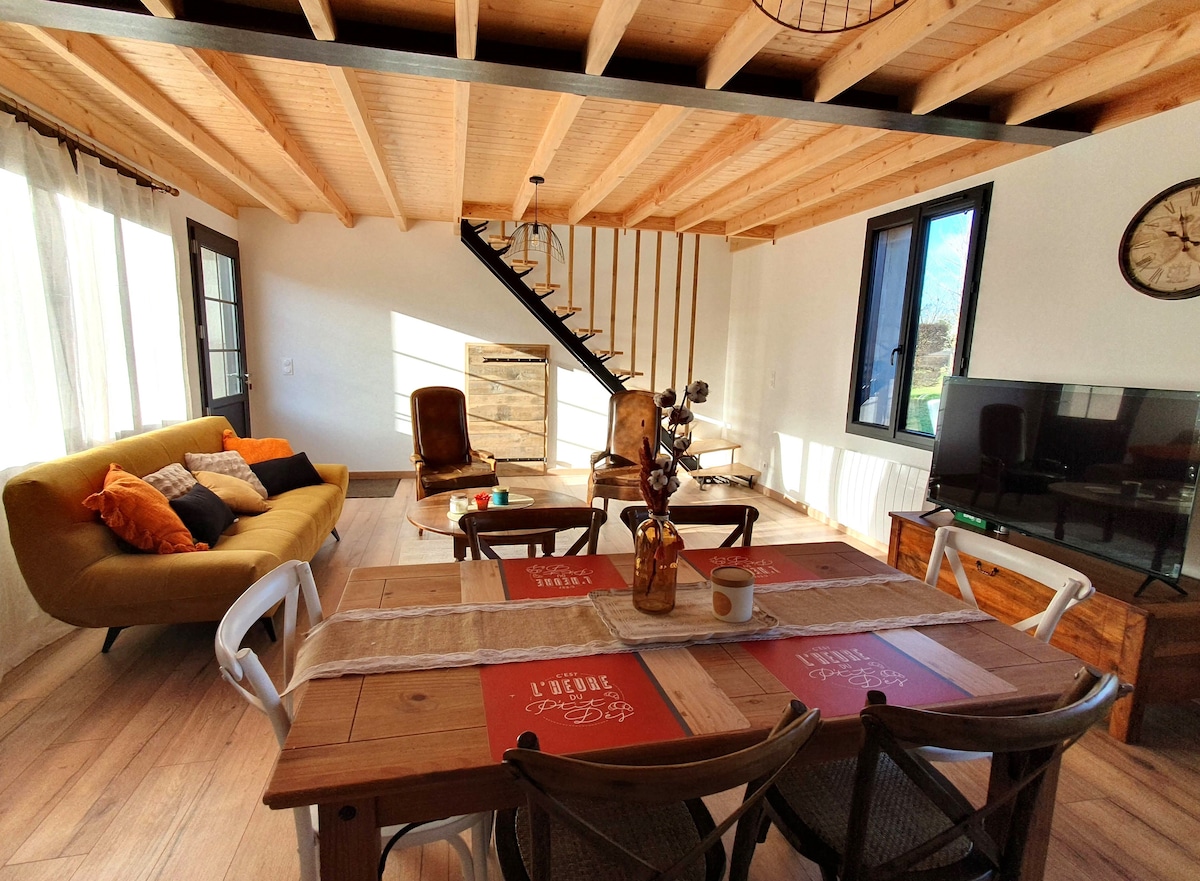 Maison indépendante. Au rez de chaussé une cuisine équipée, ouverte sur salon / séjour, salle de bain avec douche, toilette séparé. A l’étage 2 chambres (1 chambre avec 1 lit de 2 personnes 140X190cm et une seconde chambre avec 1 lit de 2 personnes 140X190 et 1 lit d’une personne 90X190). Extérieur : Grand jardin paisible à l’arrière de la maison. Une cour à l’avant avec terrasse bois et emplacement pour garer les véhicules Nos amis les animaux ne sont pas acceptés dans cet établissement