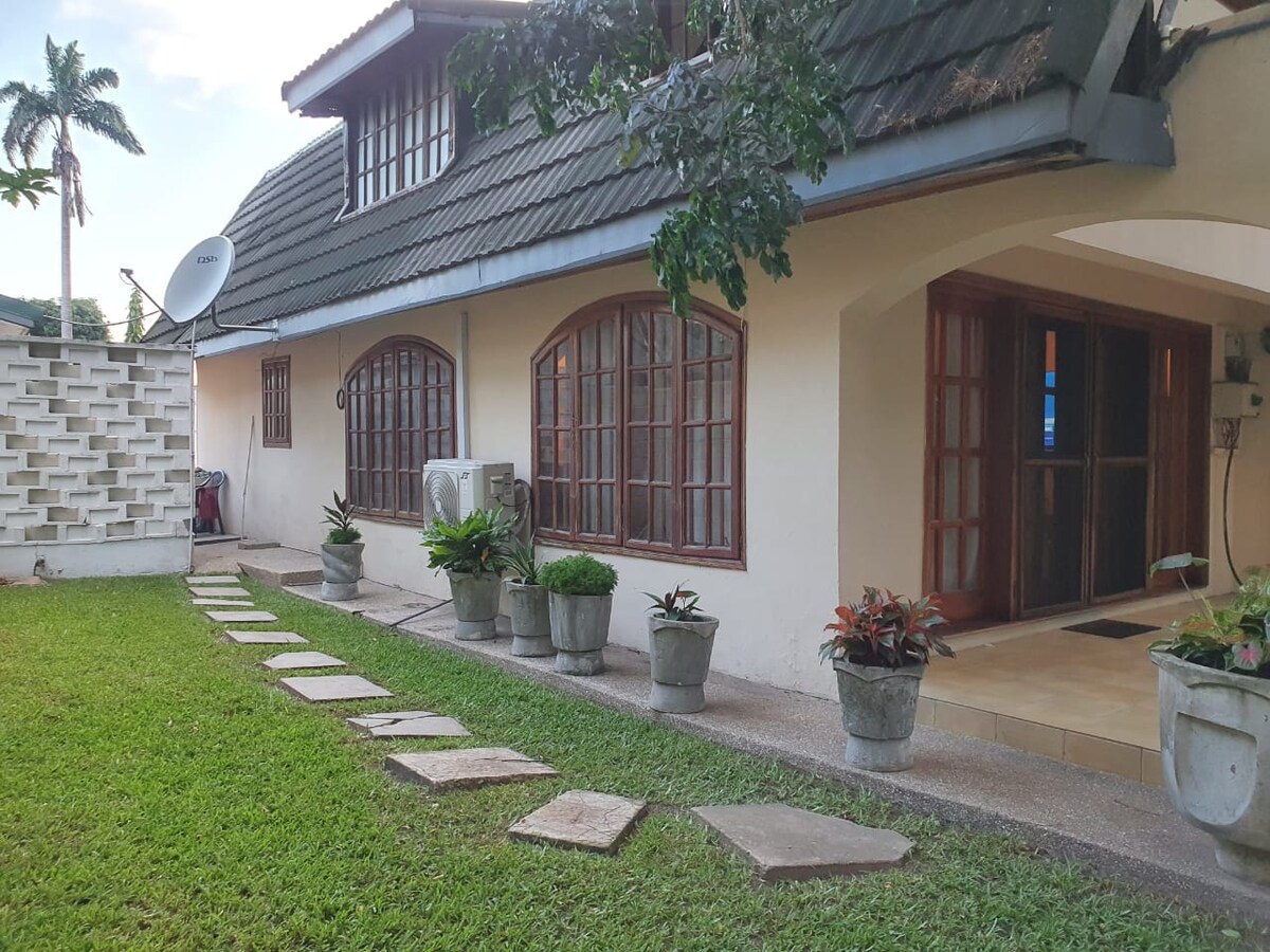 Xoş evimizə xoş gəlmisiniz 🏡🌴 Şəhərin mərkəzində əsl evdə qonaqlamaqdan zövq alın. Böyüyən bağa aydın mənzərə ilə çoxlu məkan və təbii işıq nəzərə alınaraq dizayn edilib. Çoxlu fasilə, dinclik və sakit əlaqə qurmaqdan zövq alan kiçik qruplar və ailələr üçün çox əlverişlidir. Düz hava limanının arxasındadır və Şərqi Leqon, Kanton və Labone-dan 10 dəqiqədən az məsafədədir. Bu evi kiçik ailəmiz üçün tikdik - indi şəhərdən kənarda olarkən məkanımızı qonaqlar üçün açırıq. Evimizdən zövq alın! 💕