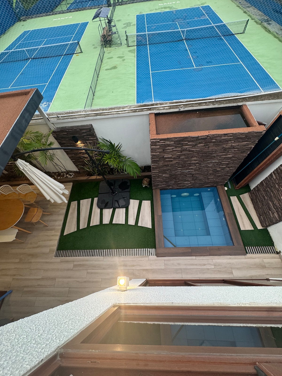Casa nueva frente al mar en la mejor playa de Manabi,con servicio domestico incluido, crea recuerdos unicos en este alojamiento familiar. Disfrutarás de los más hermosos atardeceres en un paisaje único escuchando las olas del mar. Todas las habitaciones frente al mar , sala con tv y comedor dentro de la casa,cocina , lavandería , wi fi. Área social exterior con piscina y jacuzzi ; pérgola con comedor para 16 personas, sala, bar y área de bbq con parrilla y cocina.Contamos con GENERADOR ELÉCTRICO