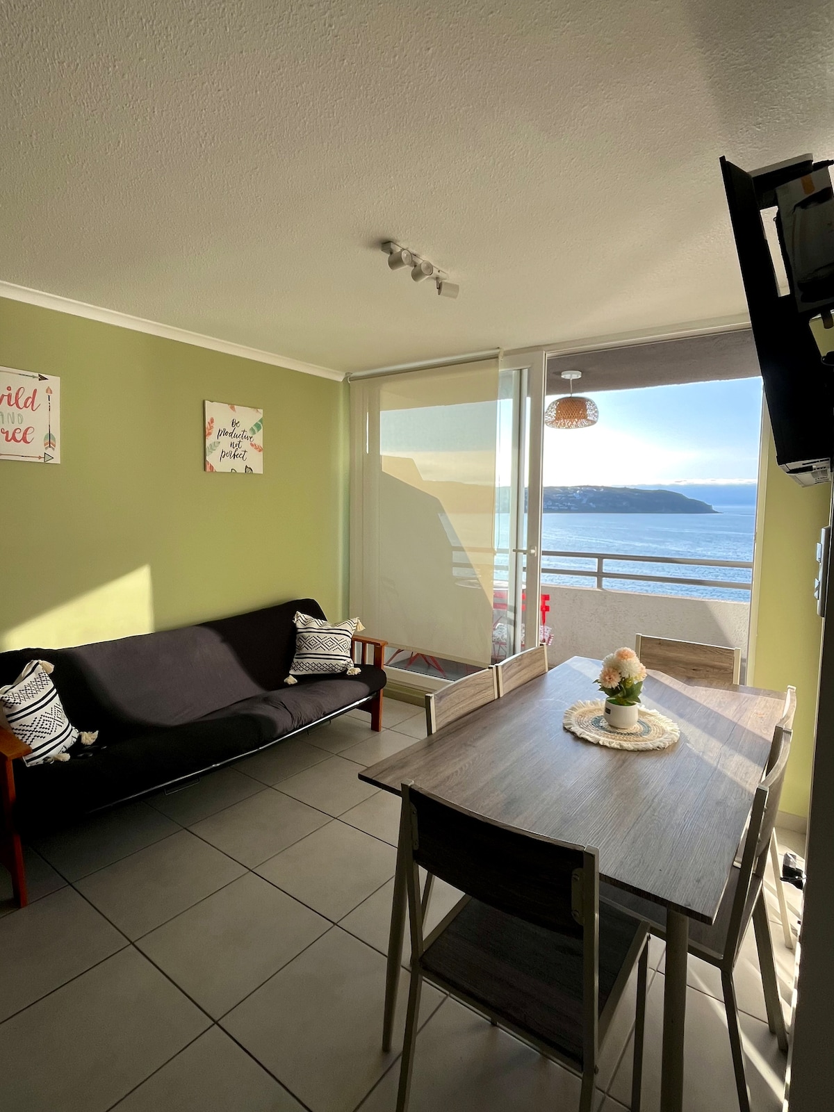 Espectacular apartamento con vista al mar en playa La Herradura,. Conexión directa a la autopista, con estacionamiento, a 3 minutos caminando de la playa, cruce seguro (puente peatonal). A pasos de restaurantes, supermercados, farmacias y otros comercios. Incluye las sillas de playa para que puedas ir cómodamente a la playa en familia. Acceso a piscina, gimnasio y quinchos dentro del recinto. *Actualmente hay una construcción al lado con ruido en horario laboral*