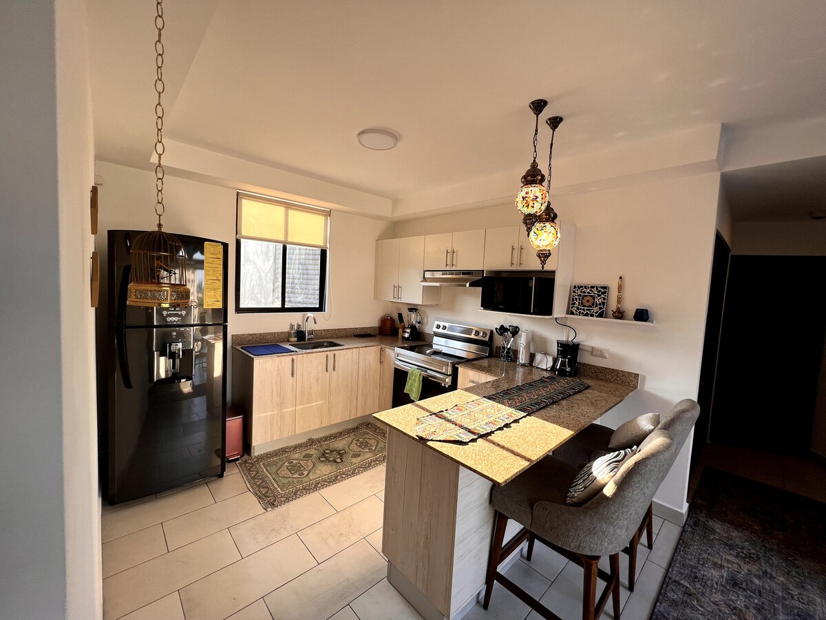 Minimalist üslublu bu gözəl, rahat və mərkəzi 1 yataq otağı olan mənzildən zövq alın; San Salvadorda, ölkənin ən eksklüziv bölgələrindən birində yerləşir. Ticarət mərkəzlərinə, restoranlara, apteklərə və supermarketlərə yaxındır. Bu mənzil maksimum 3 nəfər üçün idealdır və 1 qapalı parkinq, hovuz ərazisinə və idman zalına birbaşa giriş daxildir. Ev Ofisi, Netflix, paltaryuyan və quruducusu olan Ağıllı TV üçün 100 Mbit/s internet idealımız var.
