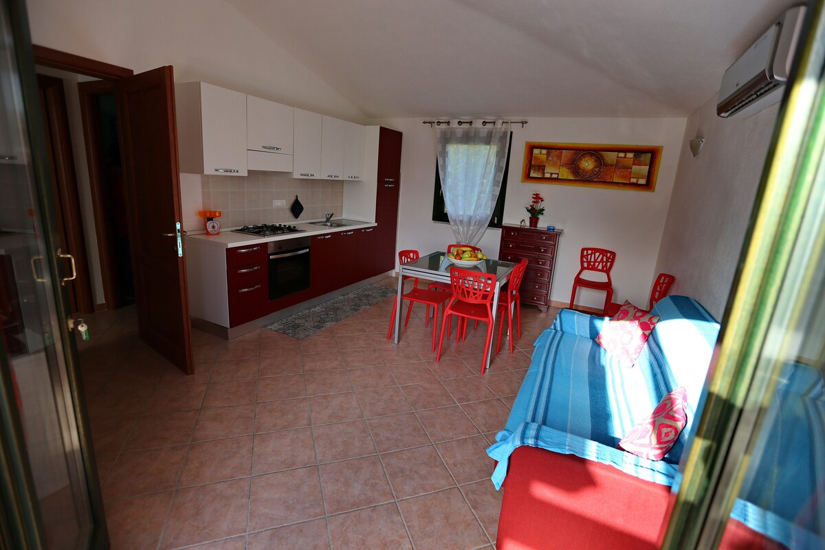 Enjoy your Sardinian getaway staying at this stylish apartment with a balcony & private parking. We are only 7 min away from the beautiful sandy beaches and right by the mountains, waterfalls and wineries. Mountain/village view from the balcony accessed from both rooms. Our place is fully equipped with kitchen essentials, towels & beach chairs. Free WiFi, Air Conditioning. Live like a local on a quiet, residential street! Send us a message to help you plan your stay!