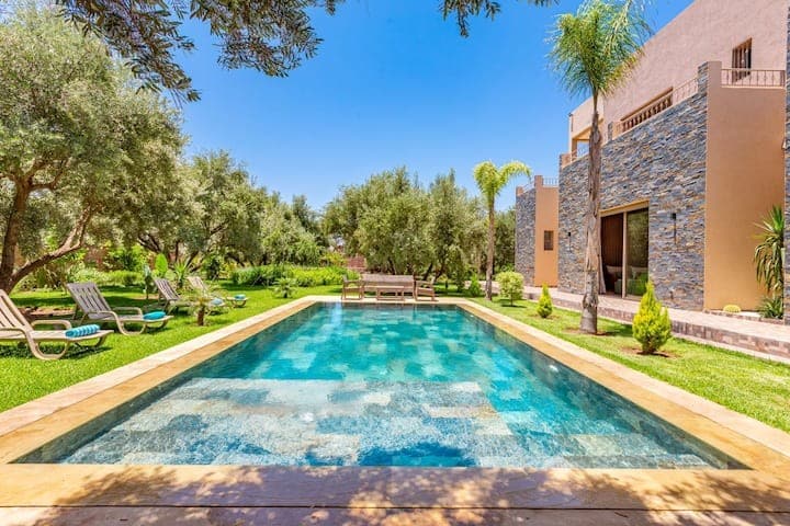 Grande maison avec Piscine, pour se retrouver en famille ou entre amis, jusqu’à 9 personnes. En toute tranquillité. Nous habitons sur place et sommes à votre disposition . Il y a 3 chambres et 3 salles de bain , une cuisine extérieure partagée avec nous , un grand espace salon intérieur avec une grande cheminée et un grand espace repas l hiver . Espace repas également dans le jardin l été . Une grande terrasse panoramique d où l on peut voir la chaîne de l atlas et le coucher de soleil .